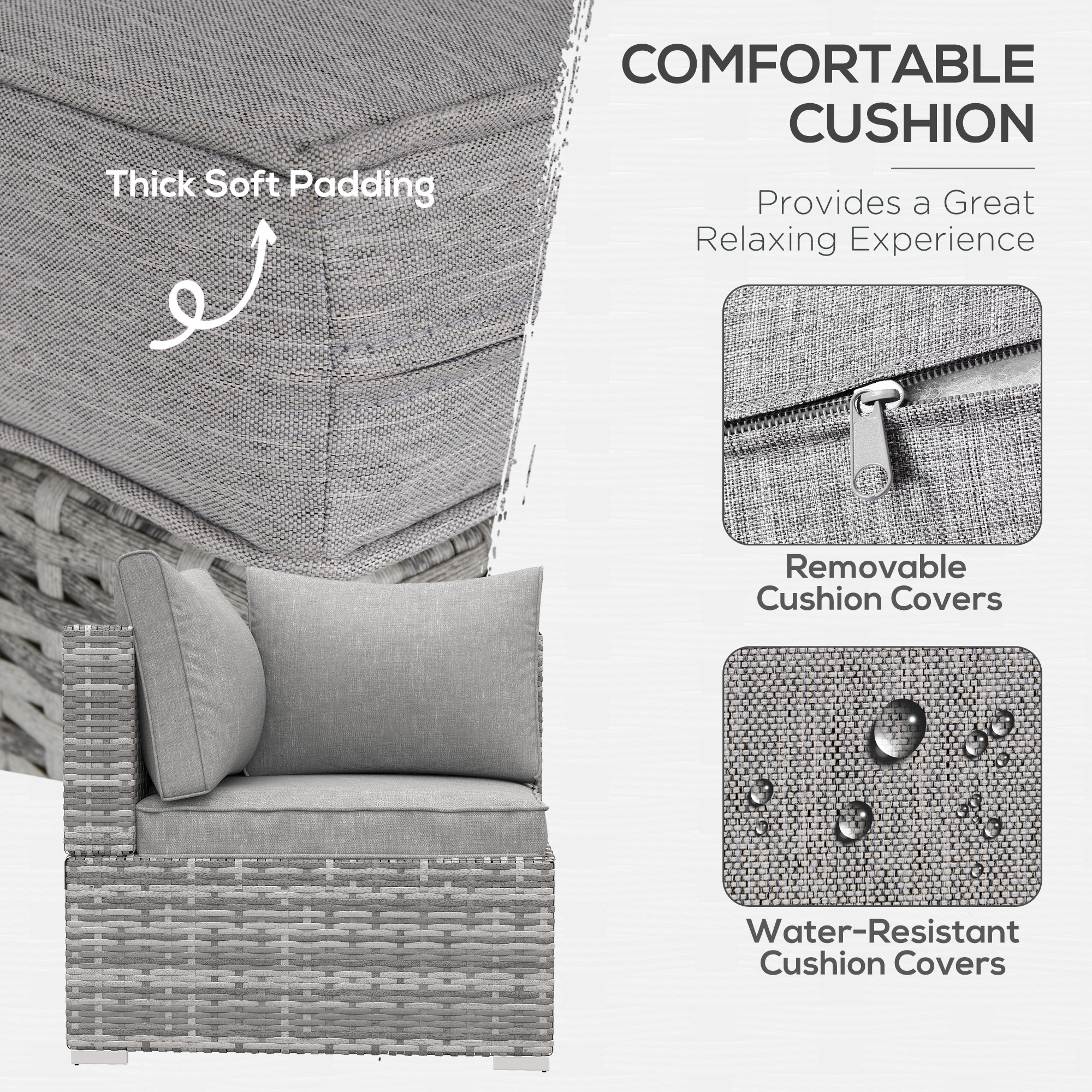 This modern rattan wicker corner sofa is must-have design from Outsunny. The core frame is made from galvanised metal, which is tough and rust-resistant for durability. It's wrapped with PE wicker for extra durability and suitability for outdoor use. Comes with a padded seat and two thick cushions for comfort - covers are removable and washable for hygiene. A great way to unwind in a cute and cosy spot outdoors with the sun on your face.