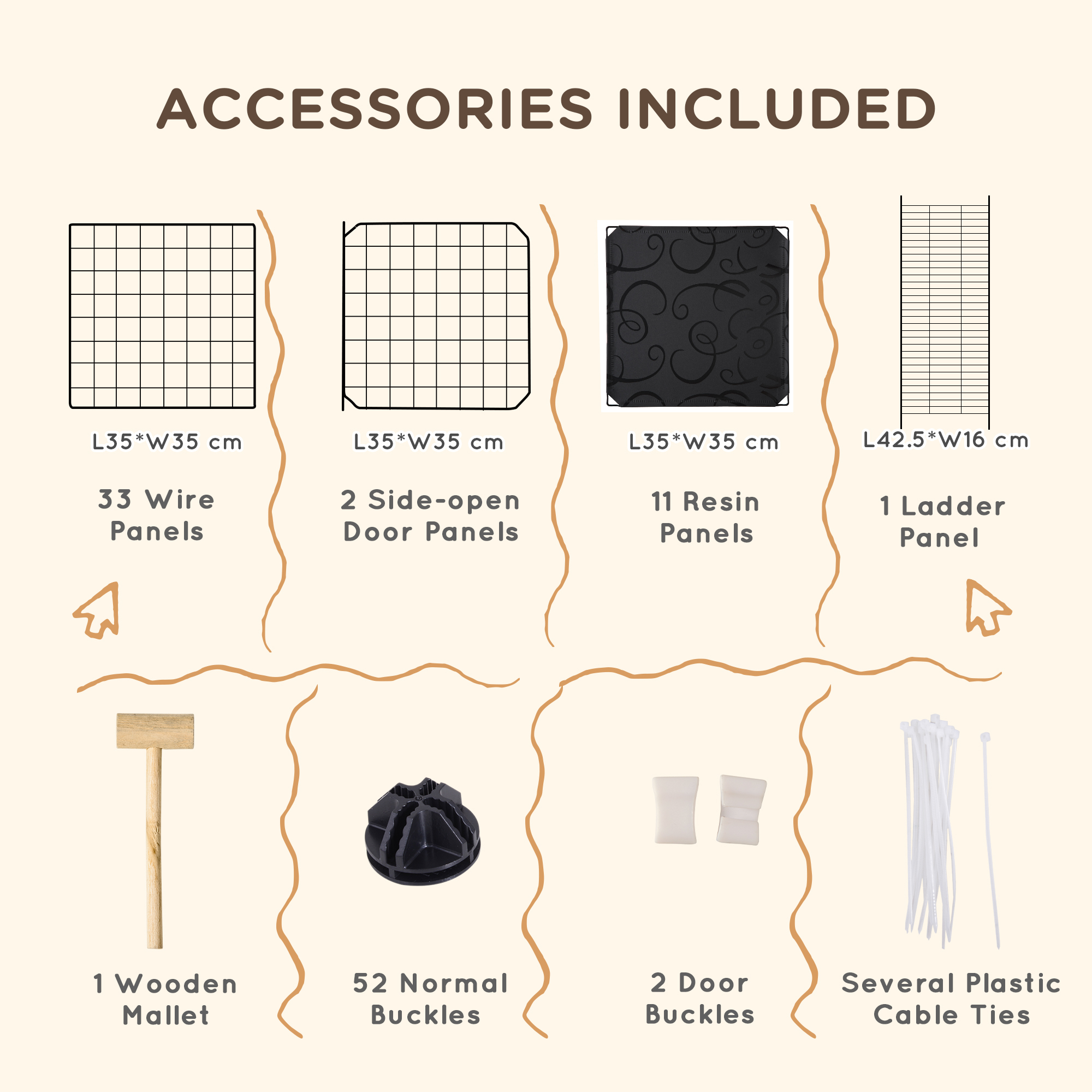 - Plastic cable ties and a wooden mallet are included to help you assemble the cage