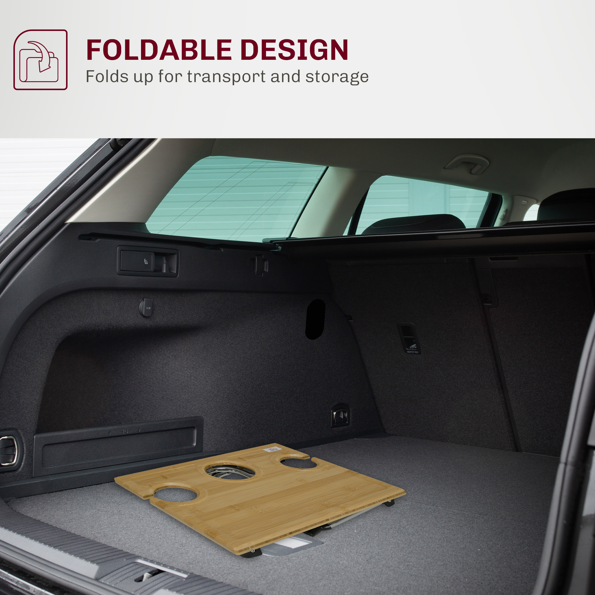 Enjoy a bottle of wine, with your favourite person - anywhere. This HOMCOM foldable table comes with a bottle and two glass holders - holding everything in place. The bamboo tabletop means a beautiful and tough holding surface, with a protective varnish coating. Steel legs for a supportive base. A foldable design to take with you anywhere.