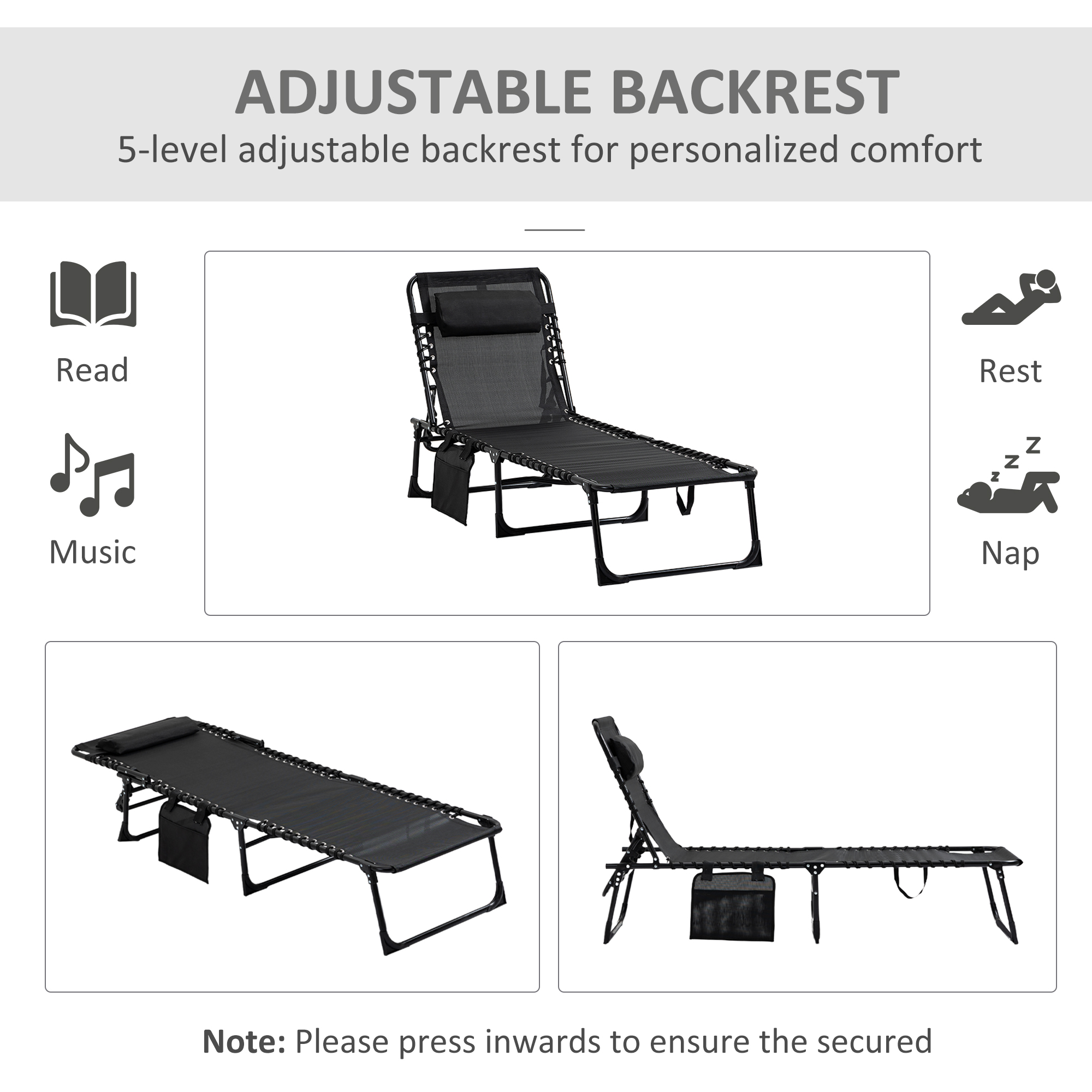 Lounge outdoors the classic way - go for this folding recliner from Outsunny. Sturdy steel frame supports up to 120kg. The back can be adjusted to five positions to relax at a position you want. There's a mesh fabric seat stretched on the frame to hold your body, with a removable pillow on the top to support your head/neck and keep it comfortable. Easily folded into a compact size, making it easy to carry and store. A perfect piece to put in your car for those weekend beach trips.
