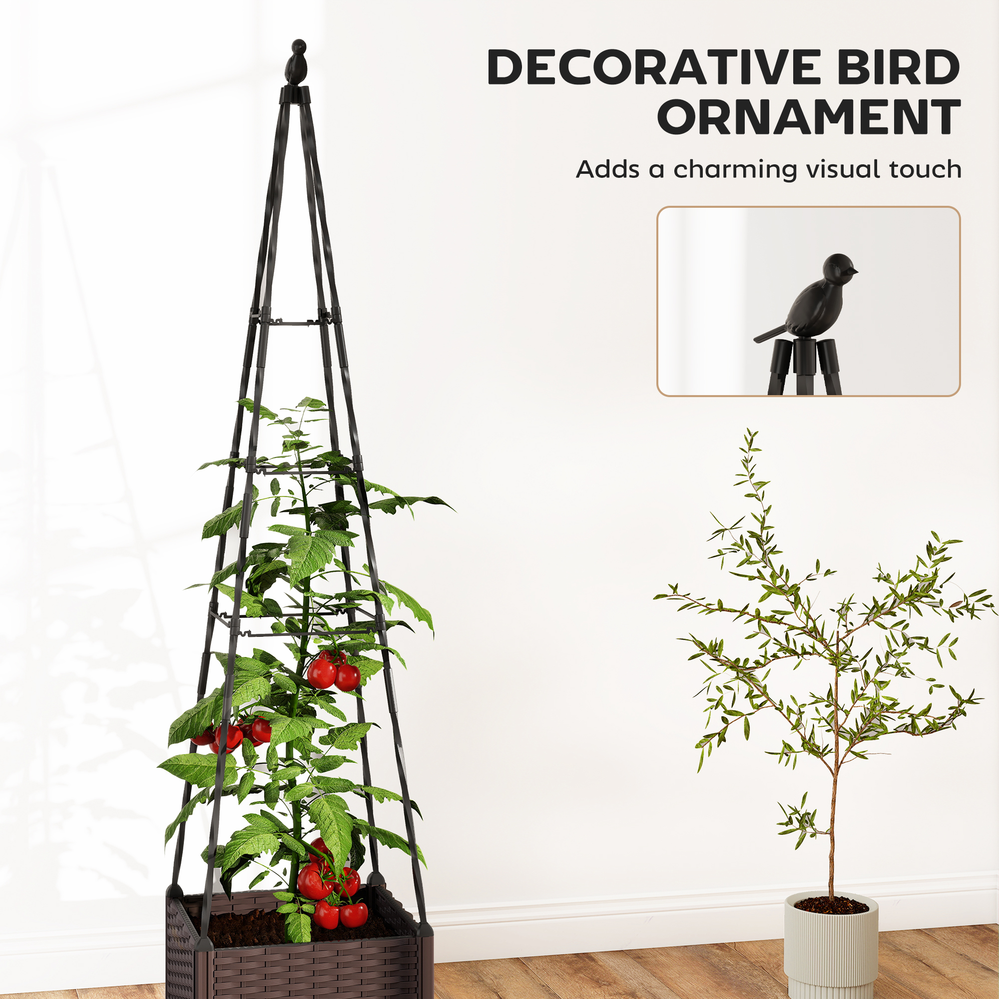 Create a thriving vertical garden with this Outsunny raised planter box and trellis. The 24. 6L planting area offers lots of room for vegetables, herbs or flowers, while the tall trellis provides strong support for tomatoes, peas and other climbers. A built-in water reservoir keeps soil consistently moist, reducing daily maintenance. Lightweight PP construction allows you move it easily to the desired sunny spot, bringing fresh greenery to any patio or balcony.