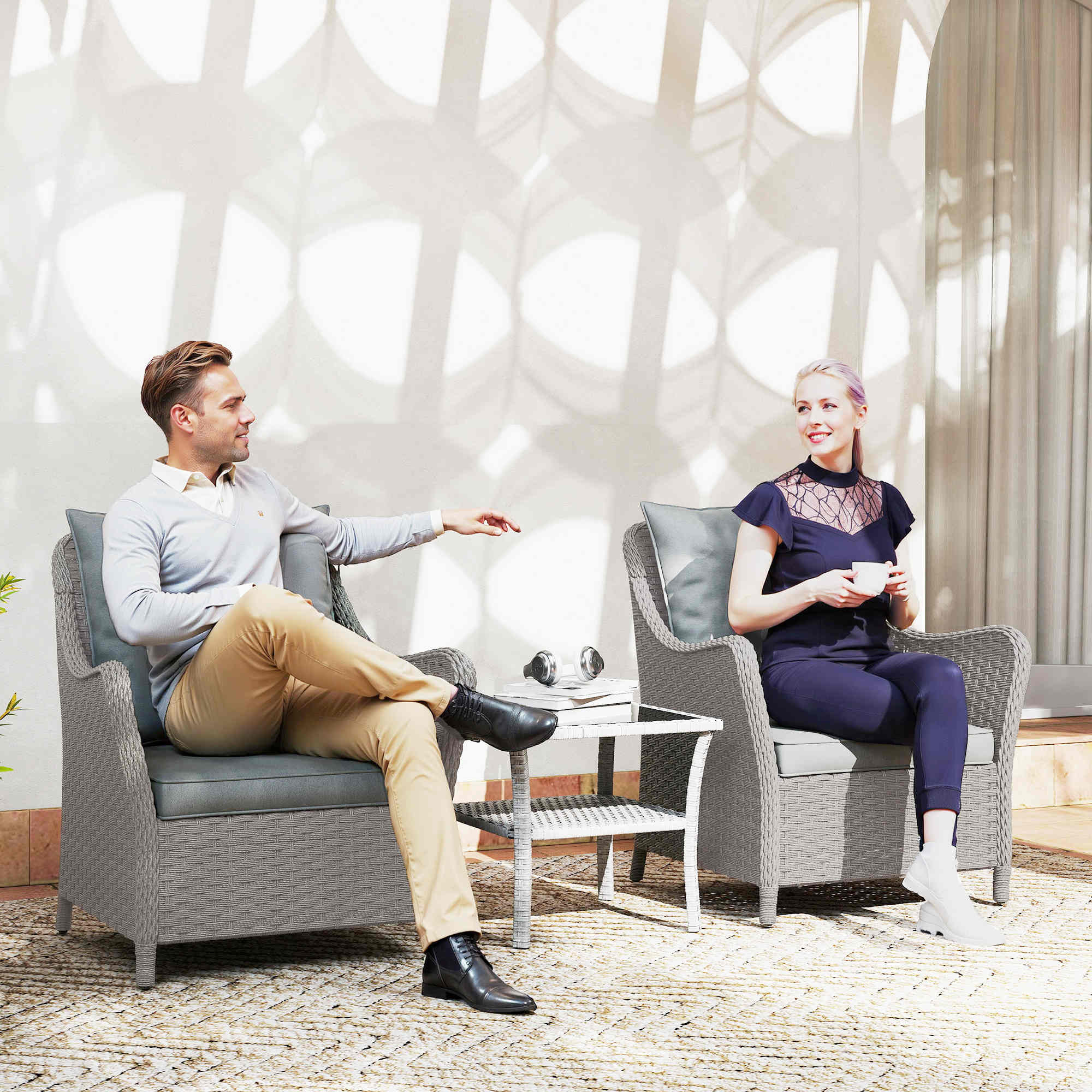 Sink into plenty of comfort outdoors with this Outsunny rattan armchair set. A steel frame with powder coating means a strong core, wrapped in tough plastic rattan for a protective outer. Soft padding seat cushions and tufted back cushions ensure comfort, with removable and washable seat cushion covers for hygiene. Each outdoor armchair is complete with curved armrests and high backs for extra relaxation.