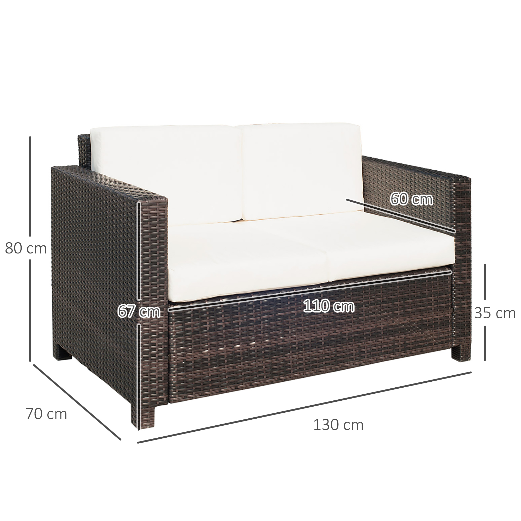 Brighten your garden with the Outsunny rattan loveseat. Made of steel frame to prevent rust and damage outdoors, wrapped in rattan for easy cleaning and is a mainstay in your garden furniture. Come with thick padded and plush cushions, as well as being water-resistant and having washable covers, with a high back and armrests for plenty of support, this outdoor couch is a great way for two persons to sit back and relax in the sun.