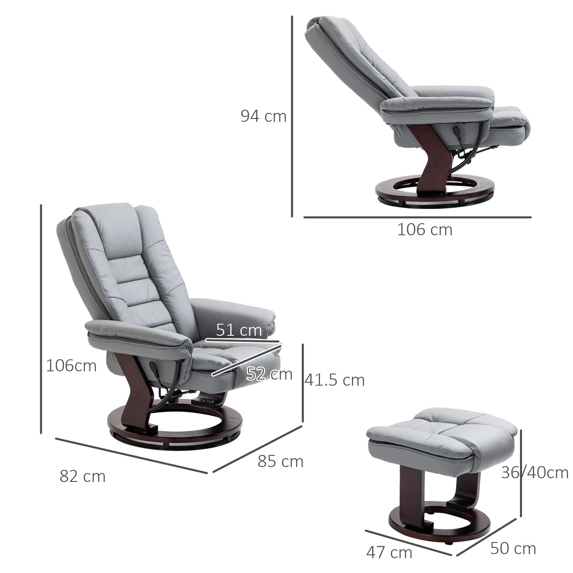 - Reclining Dimension: 85W x 106D x 94H cm