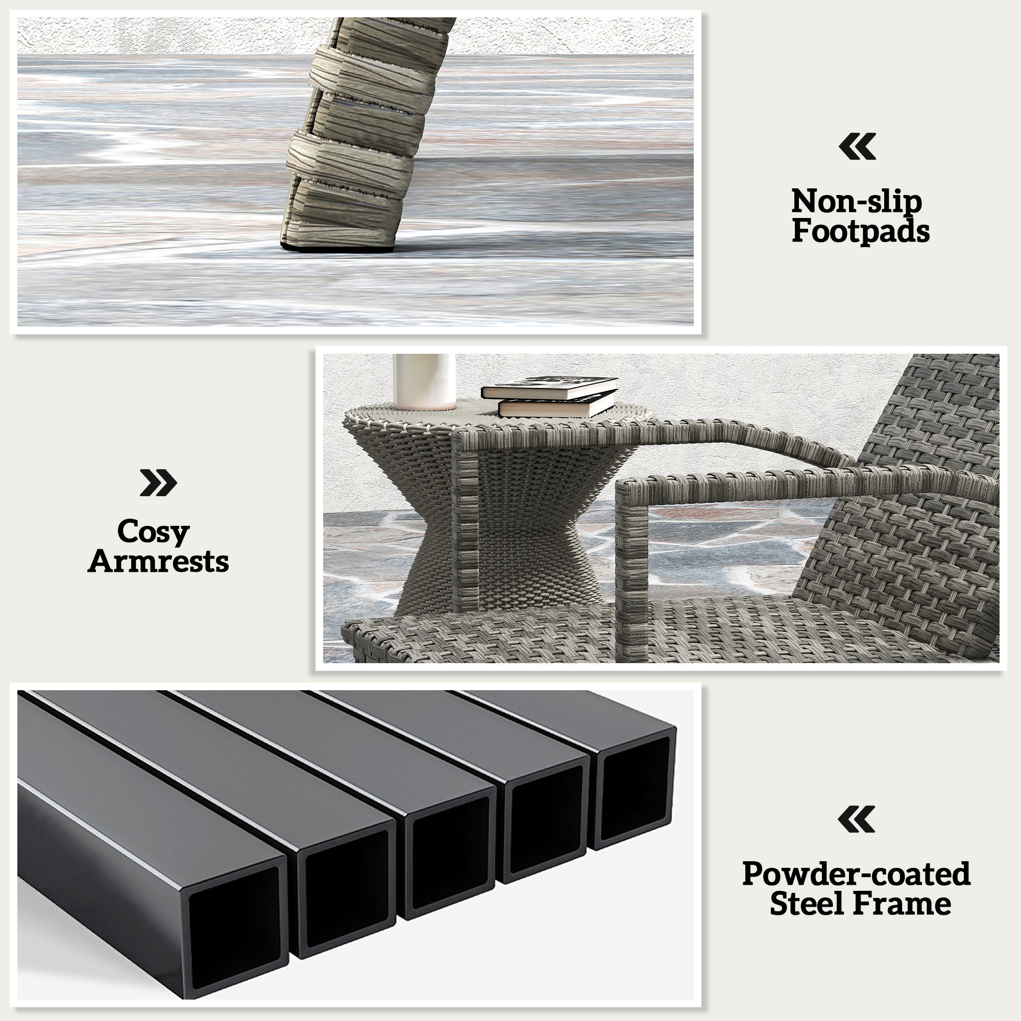 - Materials: Steel, PE Rattan, Quick Dry Cotton (100% Polyester)