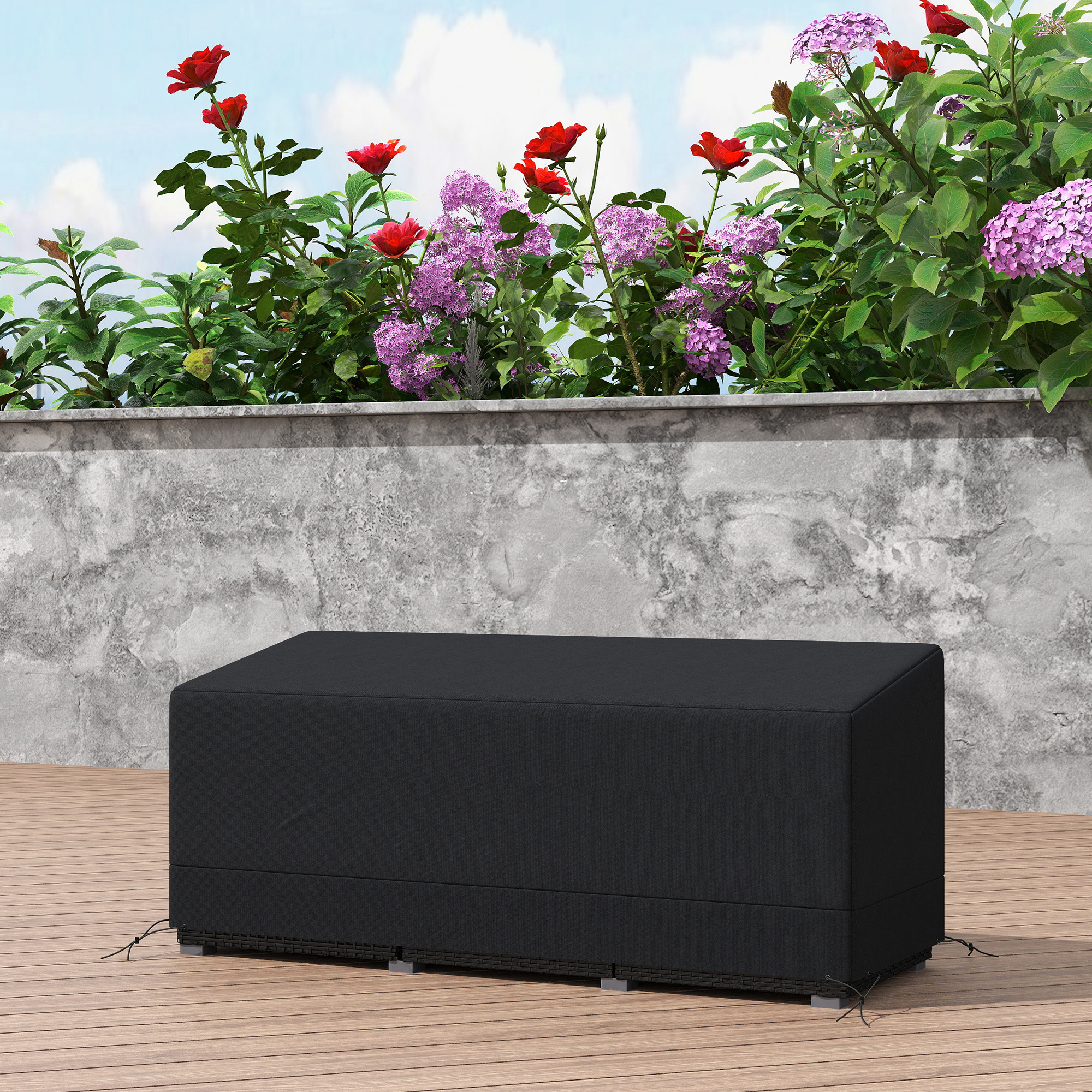 Protect your outdoor furniture in all weather conditions with this rattan corner sofa cover from Outsunny. Made of high-density 600D Oxford fabric, it features a PE coating which protects against mild water and UV seeping through and causing damage. The lightweight outdoor table cover is easy to put on and take, cutting out any struggle. Finished with pull cord fastenings for a tight and secure fit.