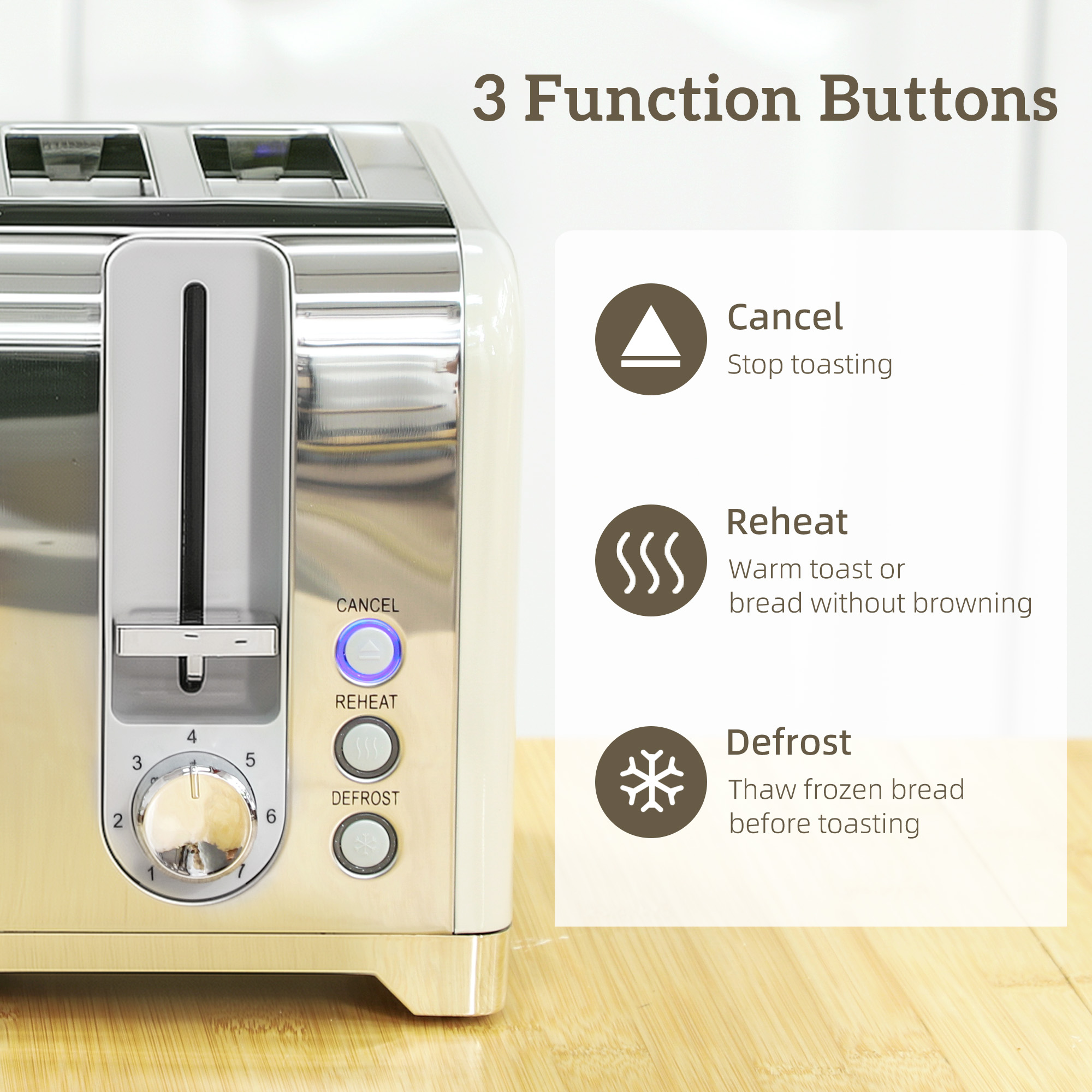 - Four-slice toaster has two controls. Defrost, reheat and cancel functions to be in control