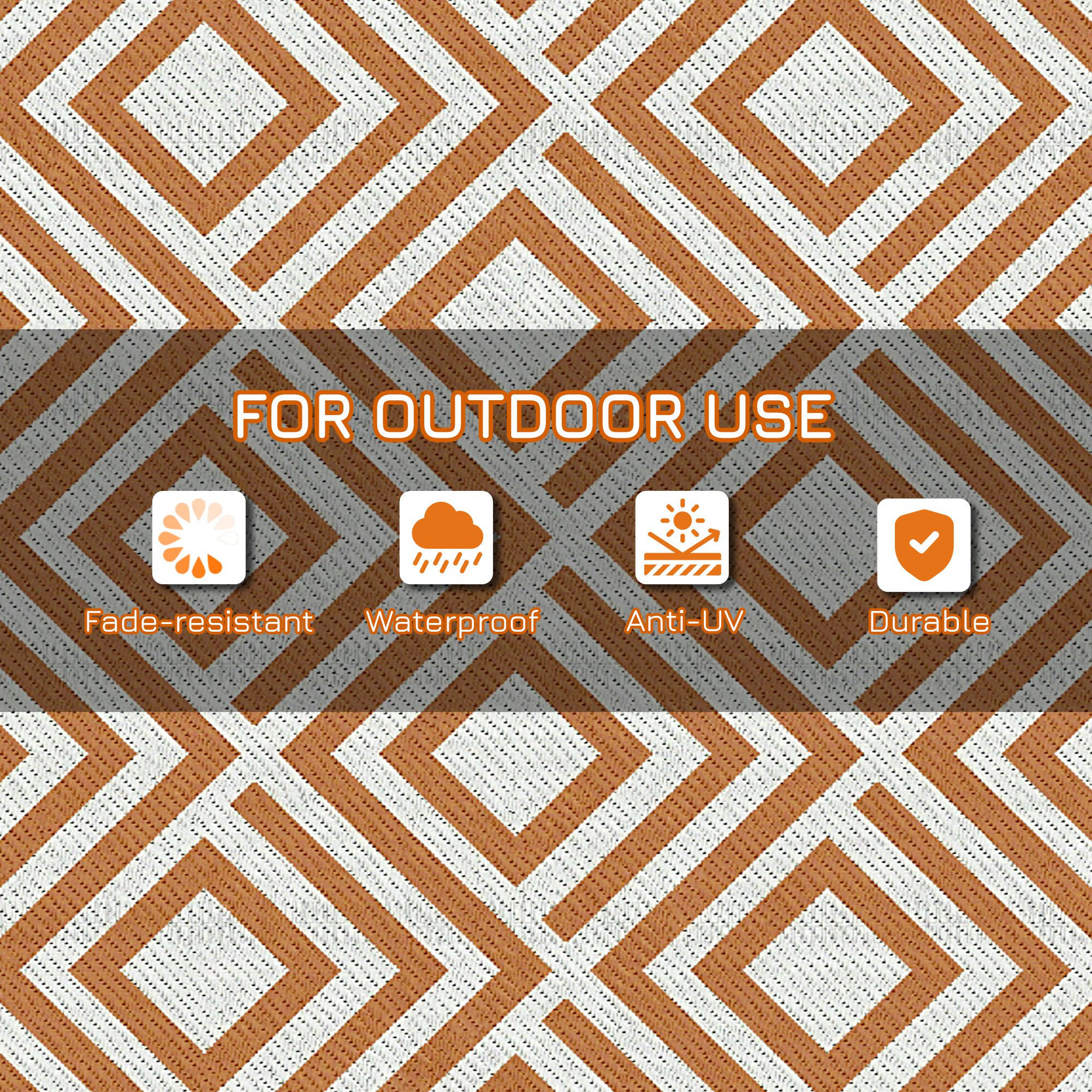 Camp on carpet with Outsunny. This porch rug is designed to handle dirt. Outdoor-ready, our rug really cleans up fast; sweep it, spray it, wipe it, or wave it; its powerful polypropylene fibers stay dry and don't saturate. Keep a plastic outdoor rug in the camper, RV, or car; it's excellent for camping, beach trips, patio picnics, or anywhere outside. The colour is reversible, meaning you can flip our plastic rug over to have a fresh side or a fresh style. Upholster the outdoors with Outsunny.