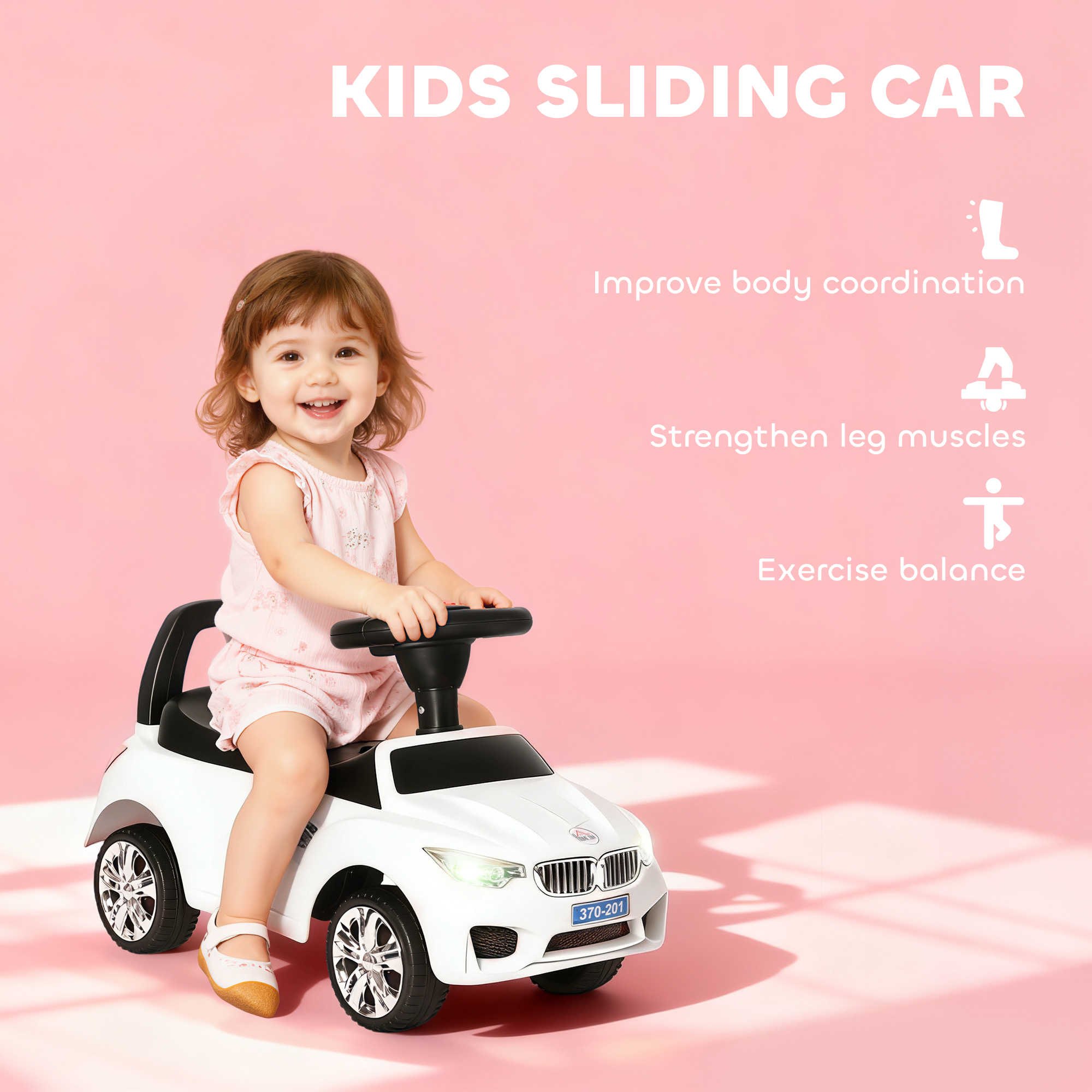 Ride in style with this chic foot-to-floor ride-on from HOMCOM. Its sleek white look and snazzy rims make it resemble a real car, while lights and music enhance the fun. Suitable for ages 18-36 months, it features PP seats and high backrests for comfort. The under-seat storage holds toys and snacks for every adventure. With a big steering wheel and anti-tipping system, it provides secure, controlled rides, making playtime both fun and secure!