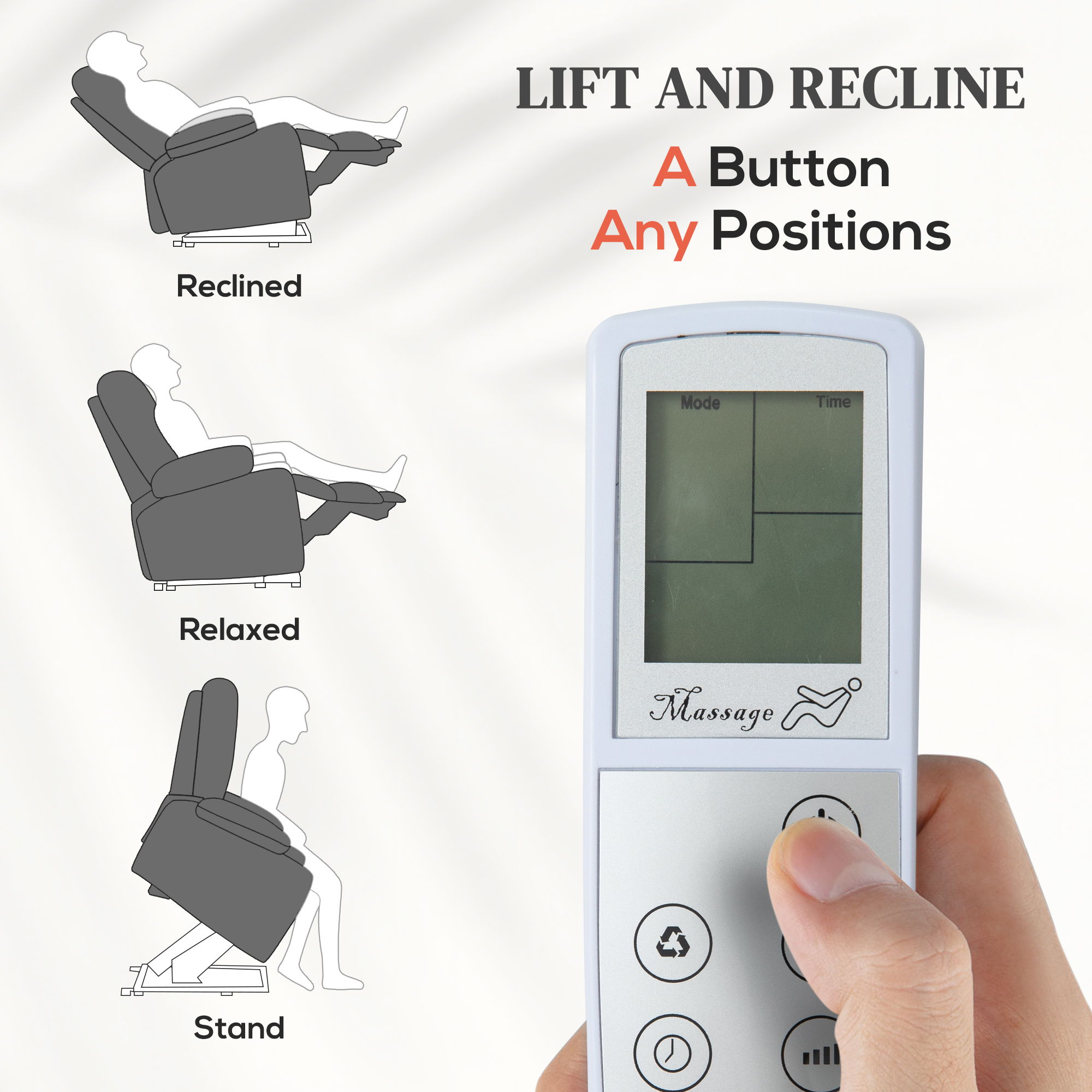 - Eight massage points to relax the back, lumbar, thighs, and legs. Six modes with three intensity levels