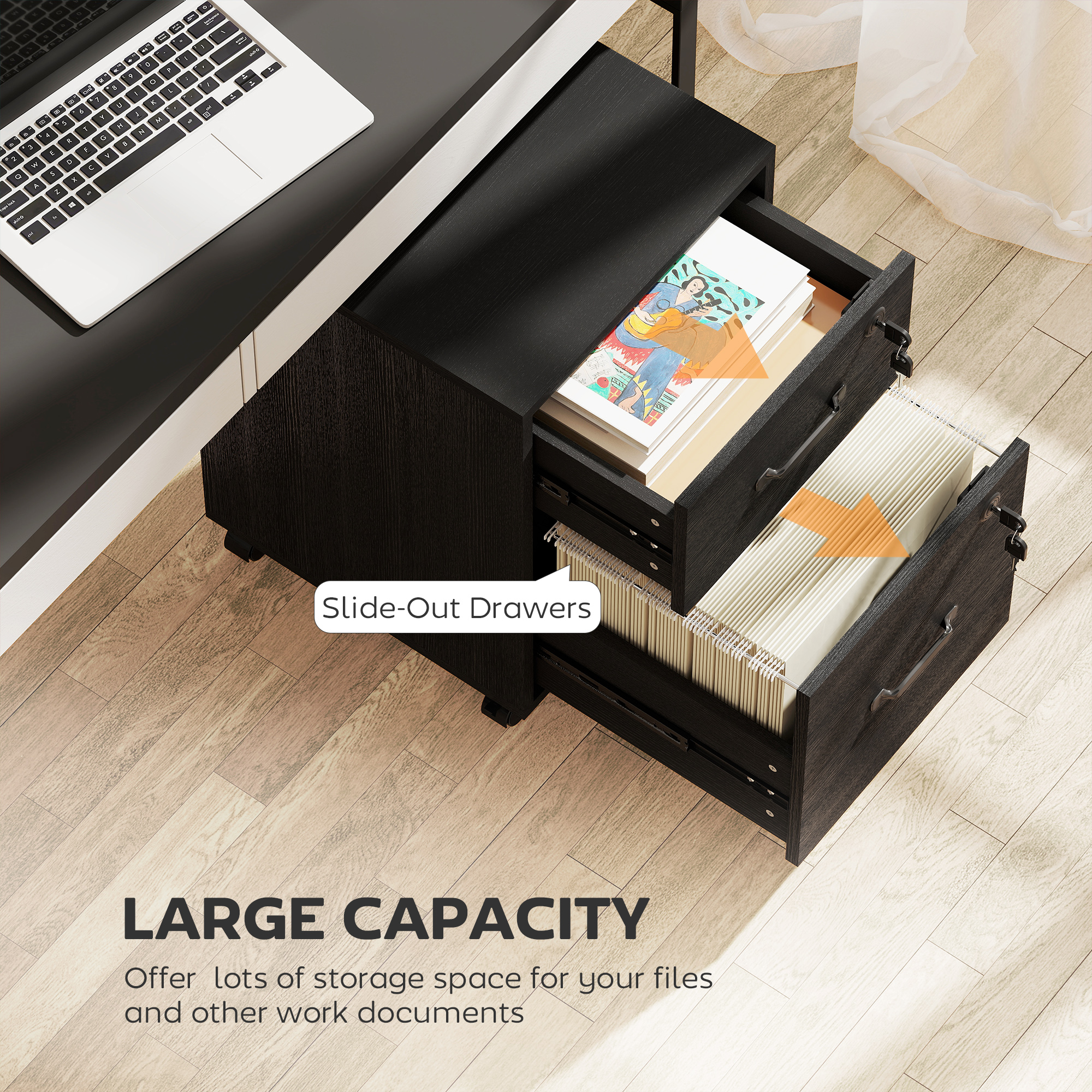 Blending storage space and a compact size into a sleek wood-effect design, this filing cabinet from HOMCOM is made to make you fall in love with your office space once again. It features a small top drawer and a large bottom drawer to give you all the room needed for files and stationery. There is a rail in the bottom drawer for hanging your letter files for organisation. Four wheels are fitted on the bottom for easy movement - two of which can be locked to keep the unit in place when needed.