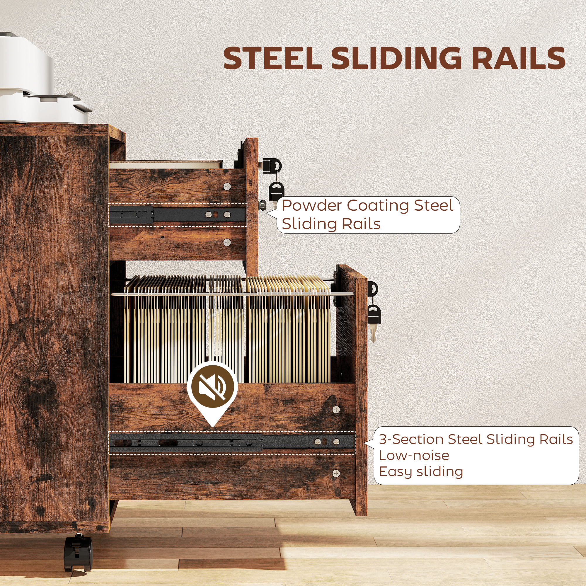 Blending storage space and a compact size into a sleek wood-effect design, this filing cabinet from HOMCOM is made to make you fall in love with your office space once again. It features a small top drawer and a large bottom drawer to give you all the room needed for files and stationery. There is a rail in the bottom drawer for hanging your letter files for organisation. Four wheels are fitted on the bottom for easy movement - two of which can be locked to keep the unit in place when needed.