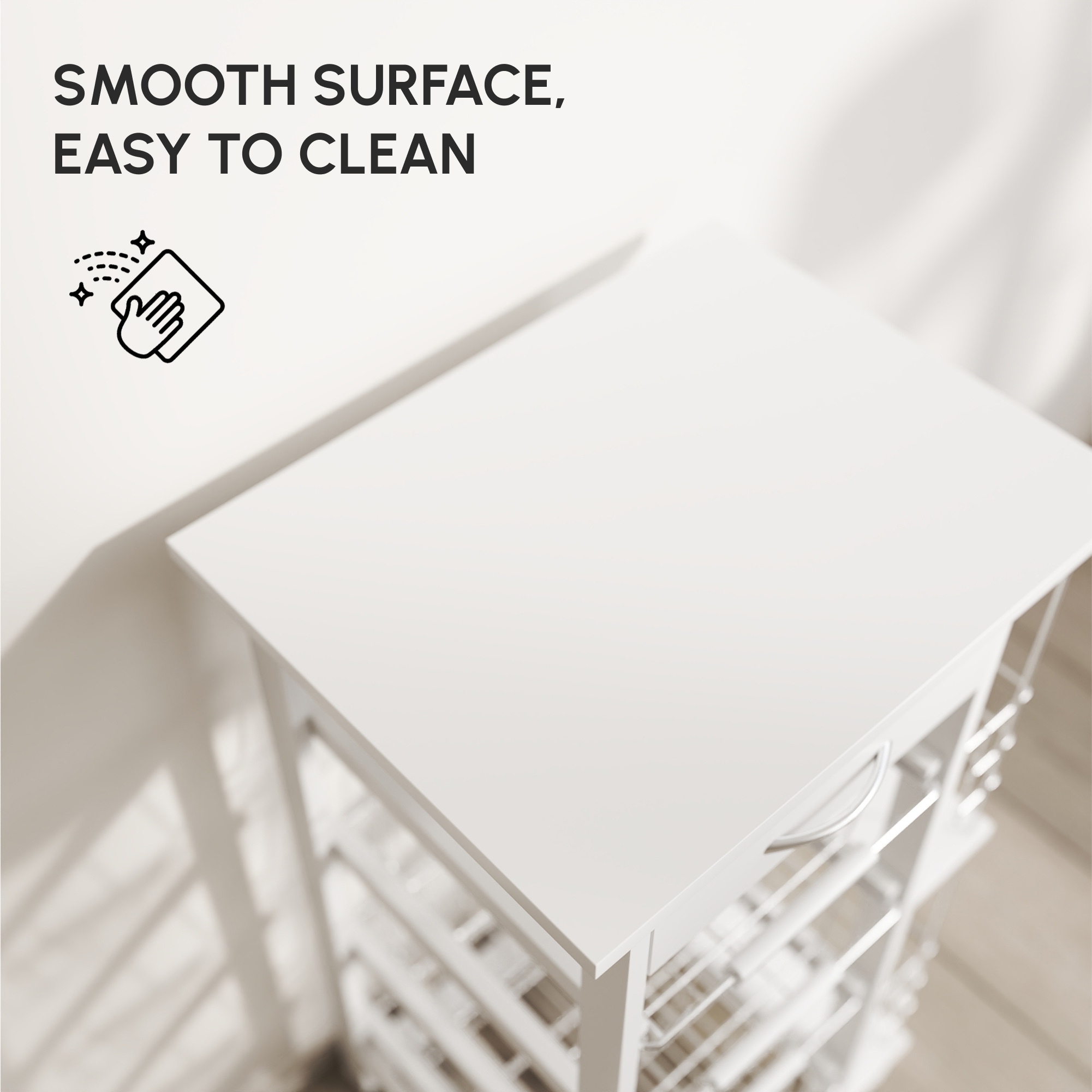 Looking to maximize your kitchen? Need a kitchen storage cart for your apartment or dorm room that won't take up tons of space? This kitchen storage cart features a compact and simple design that can be fit into various styles of decorations. Four slide-out metal baskets offer lots of storage of dry food, fruits and vegetables. Side racks are great for spices and the top drawer for cutlery and utensils and four wheels to ensure easy and smooth movement across the floor.