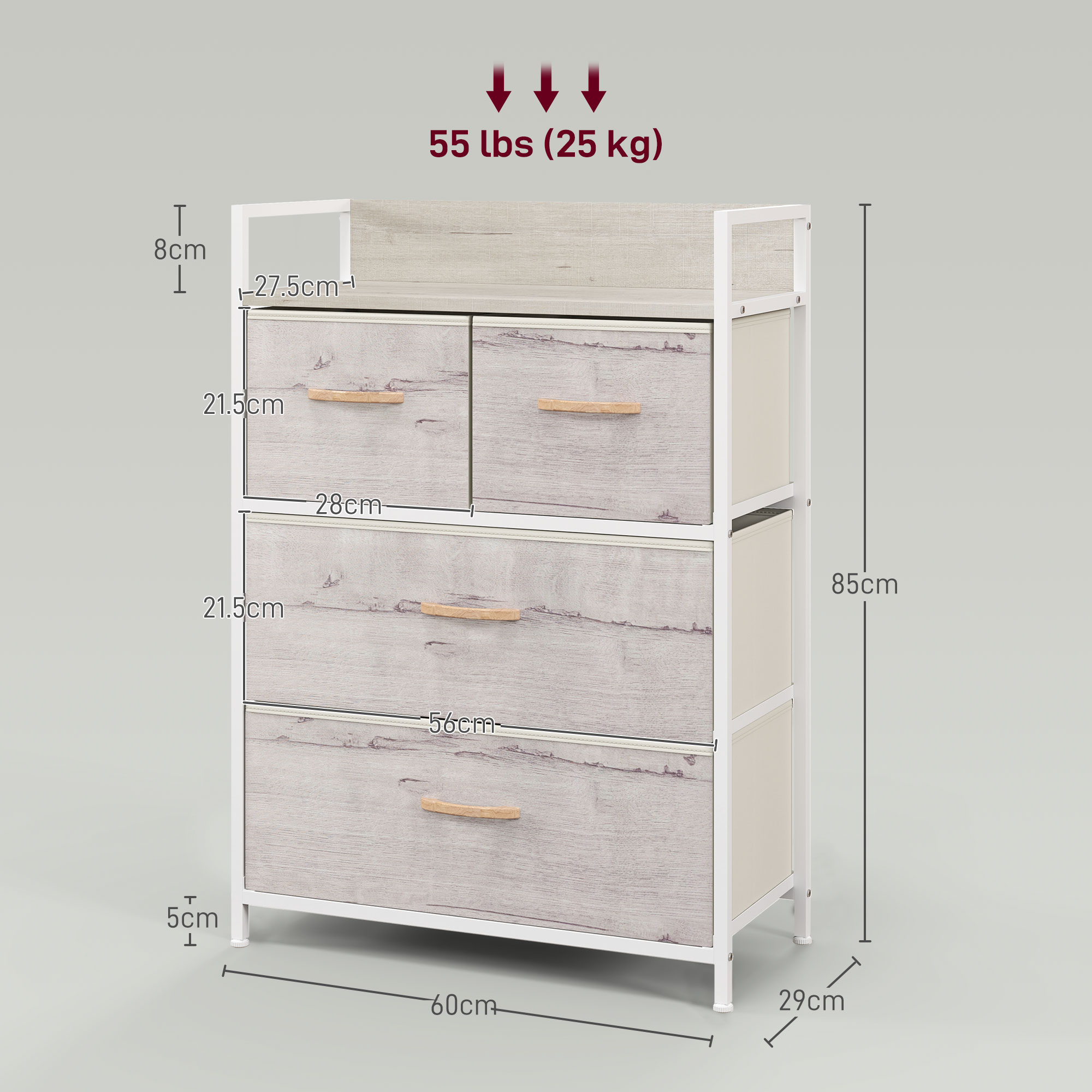 - Weight Capacity: 25kg (overall), 15kg (top), 3kg (each drawer)