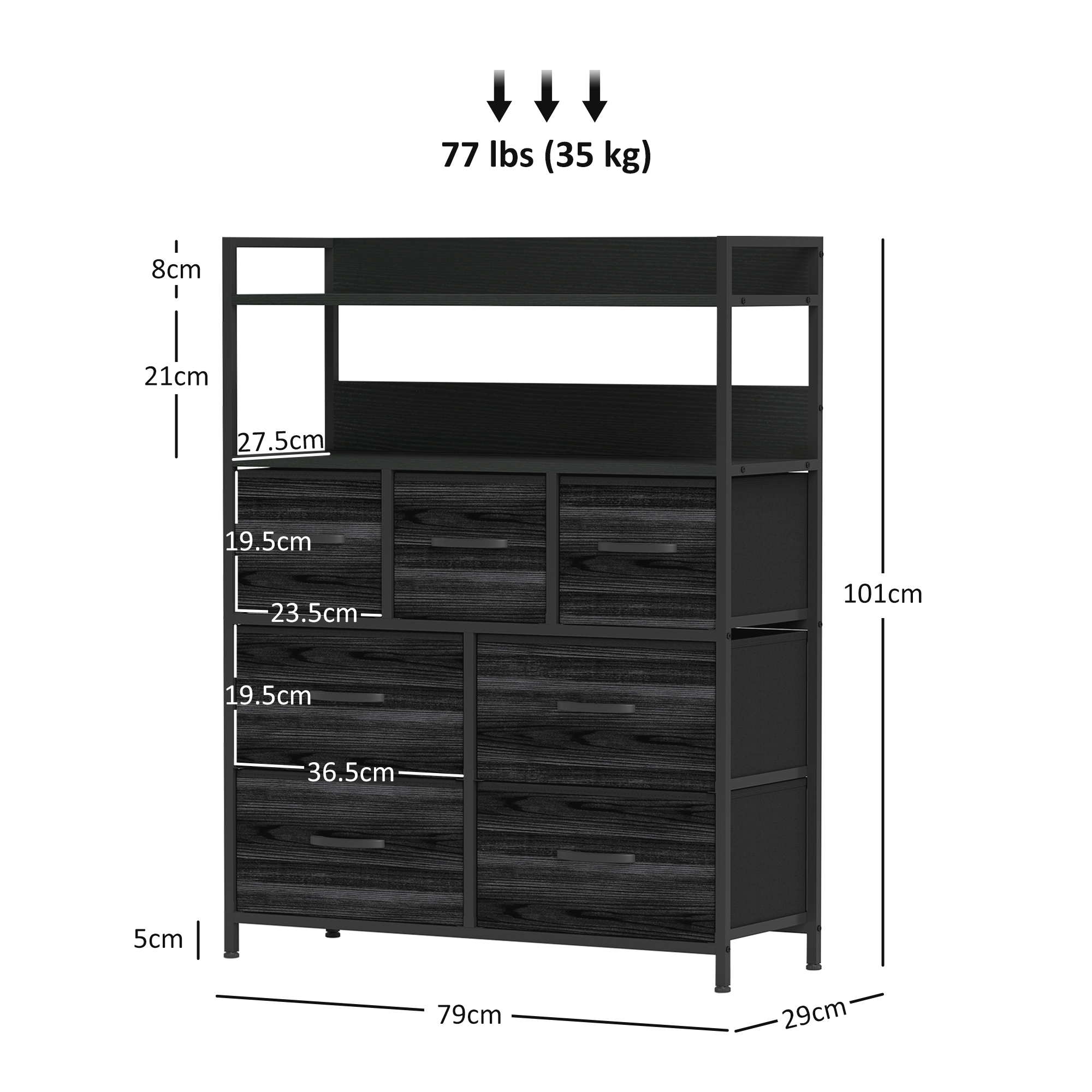 - Weight Capacity: 35kg (overall), 15kg (top), 10kg (middle shelf), 3kg (each drawer)