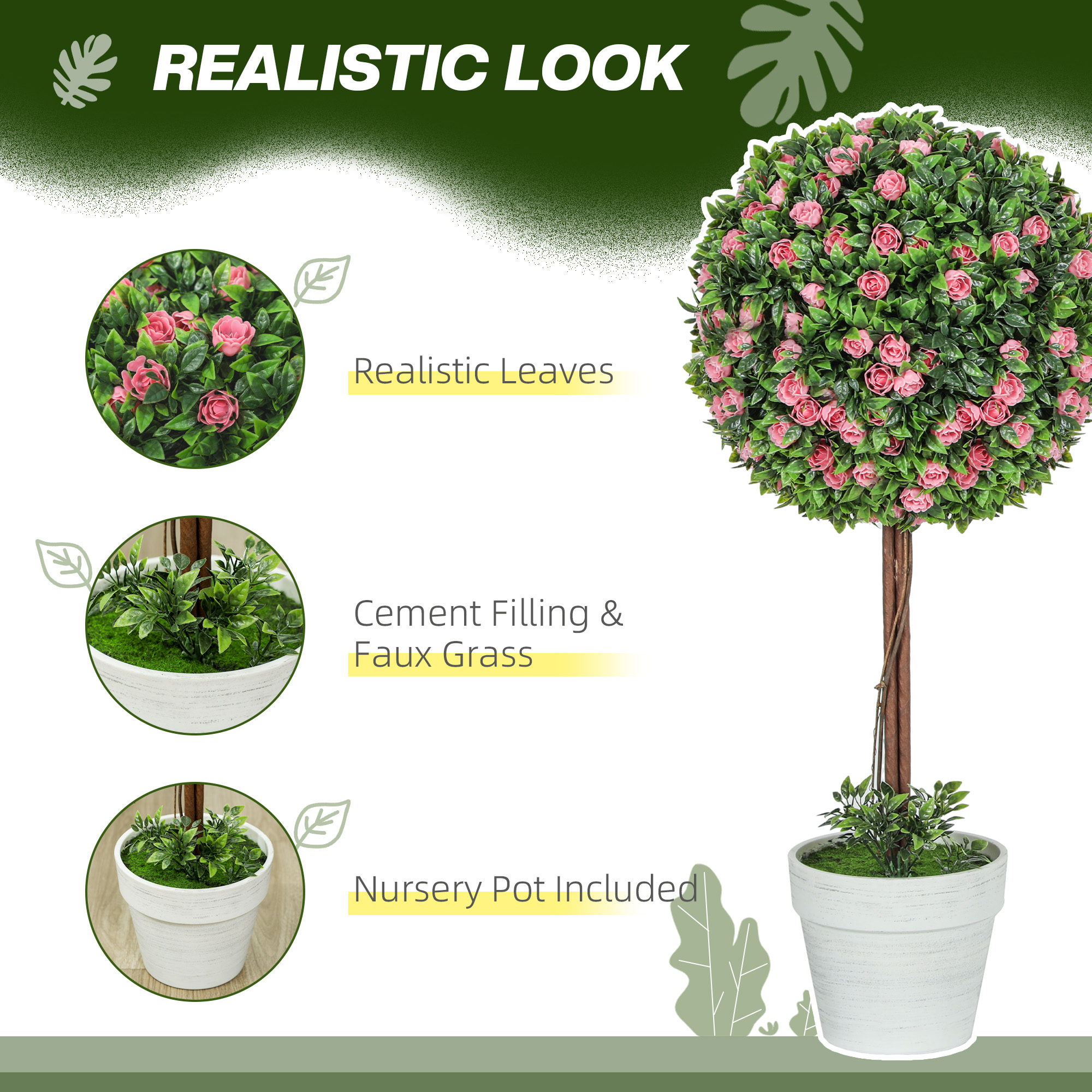- Realistic ball topiary and rose flower boosts aesthetic appeal
