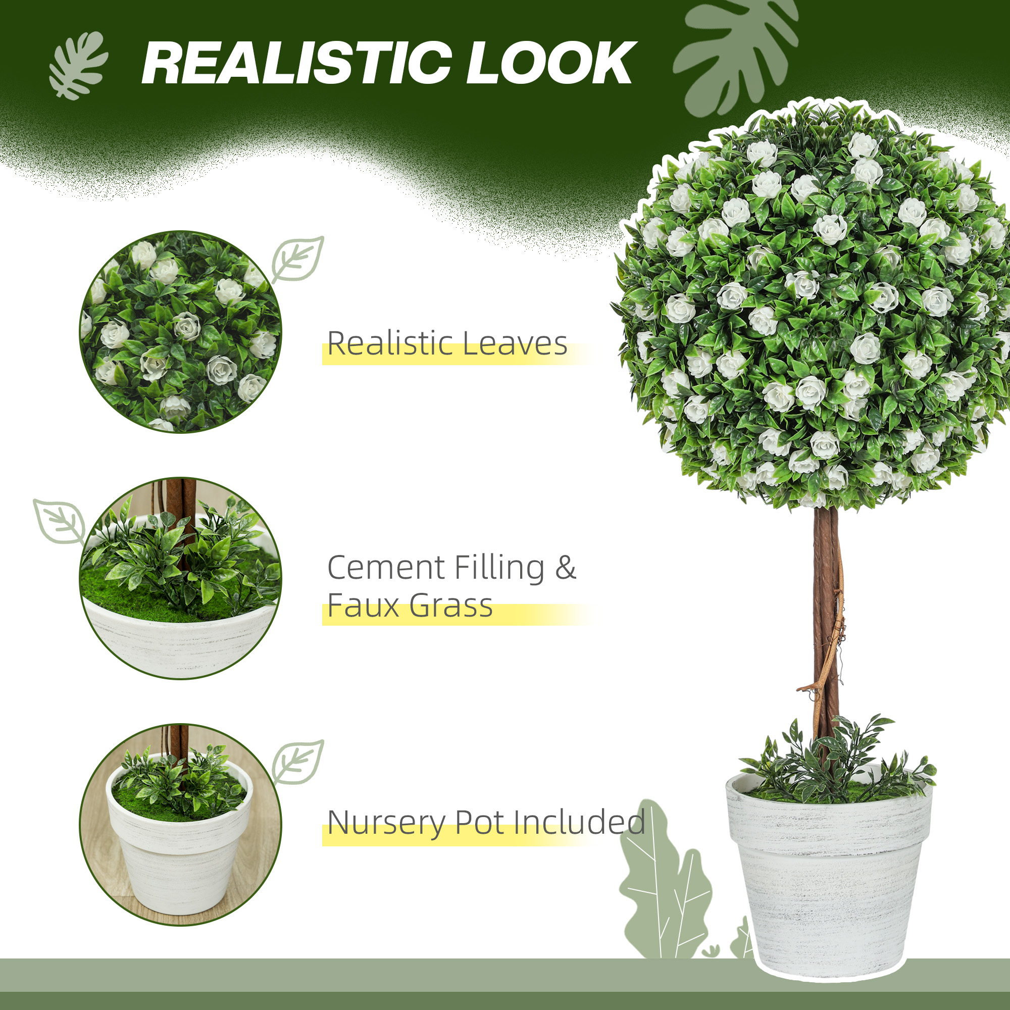- Realistic ball topiary and rose flower boosts aesthetic appeal
