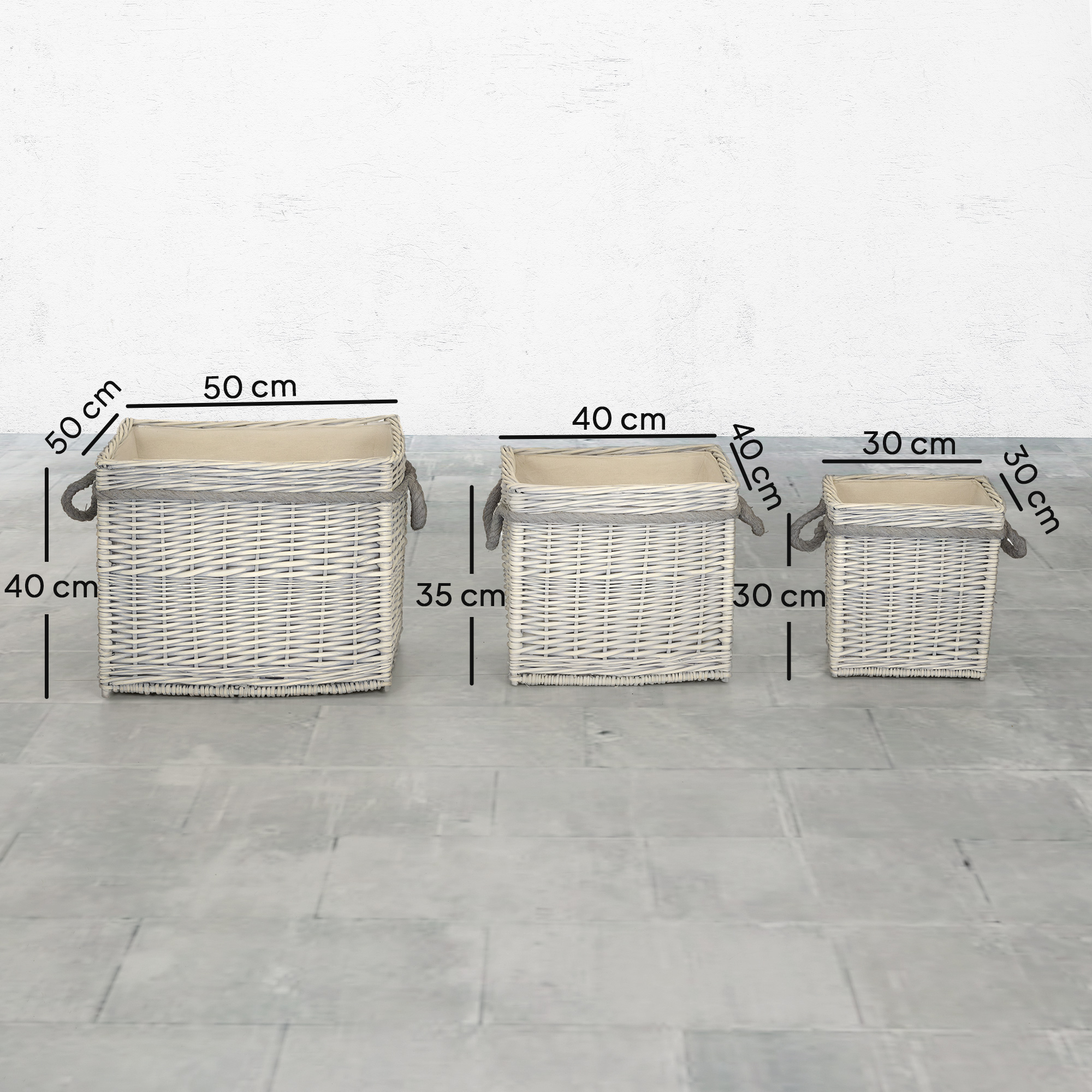 - Overall Dimensions: 50L x 50W x 40H cm (large), 40L x 40W x 35H cm (medium), 30L x 30W x 30H cm (small)