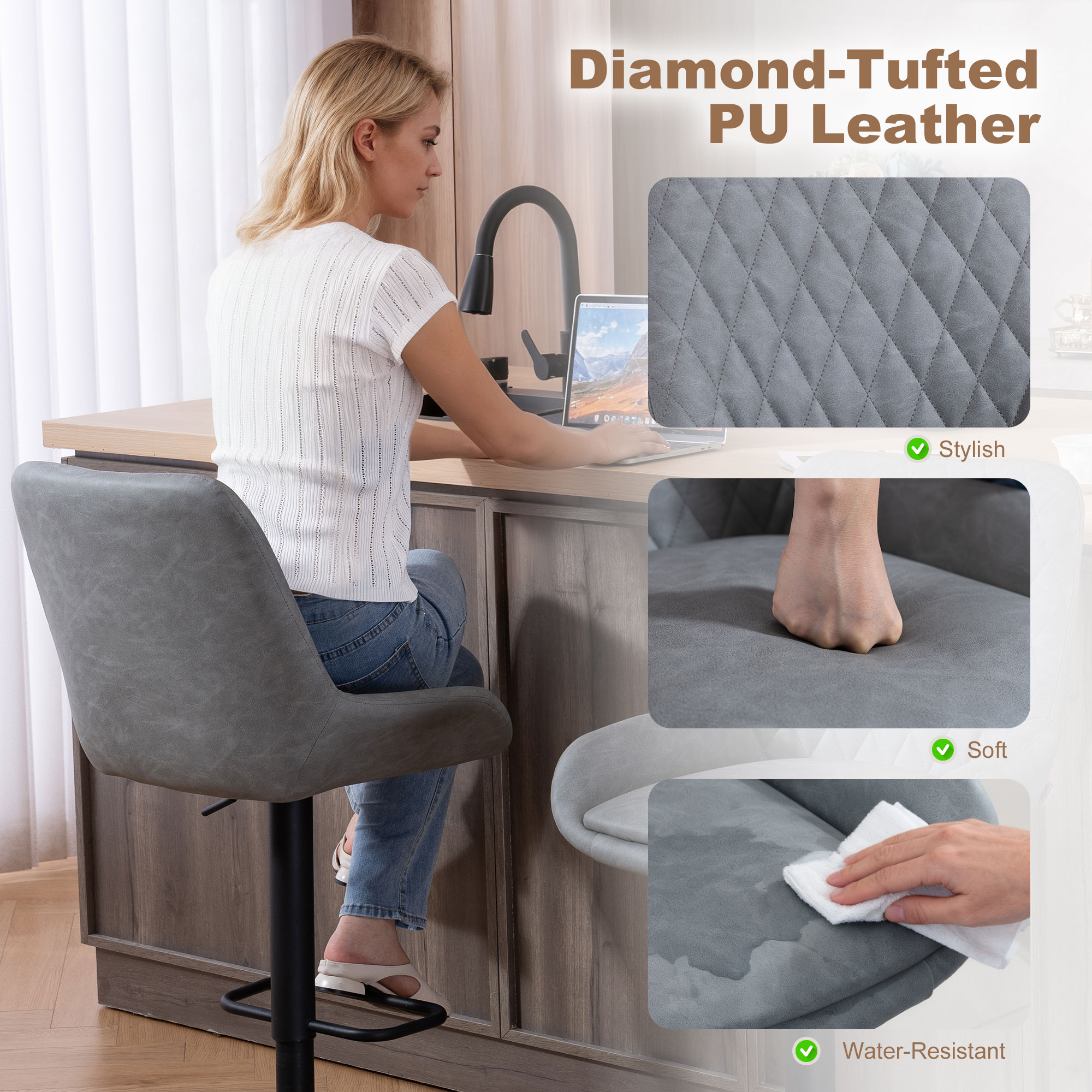 - Seat height is adjustable from bar height to counter height