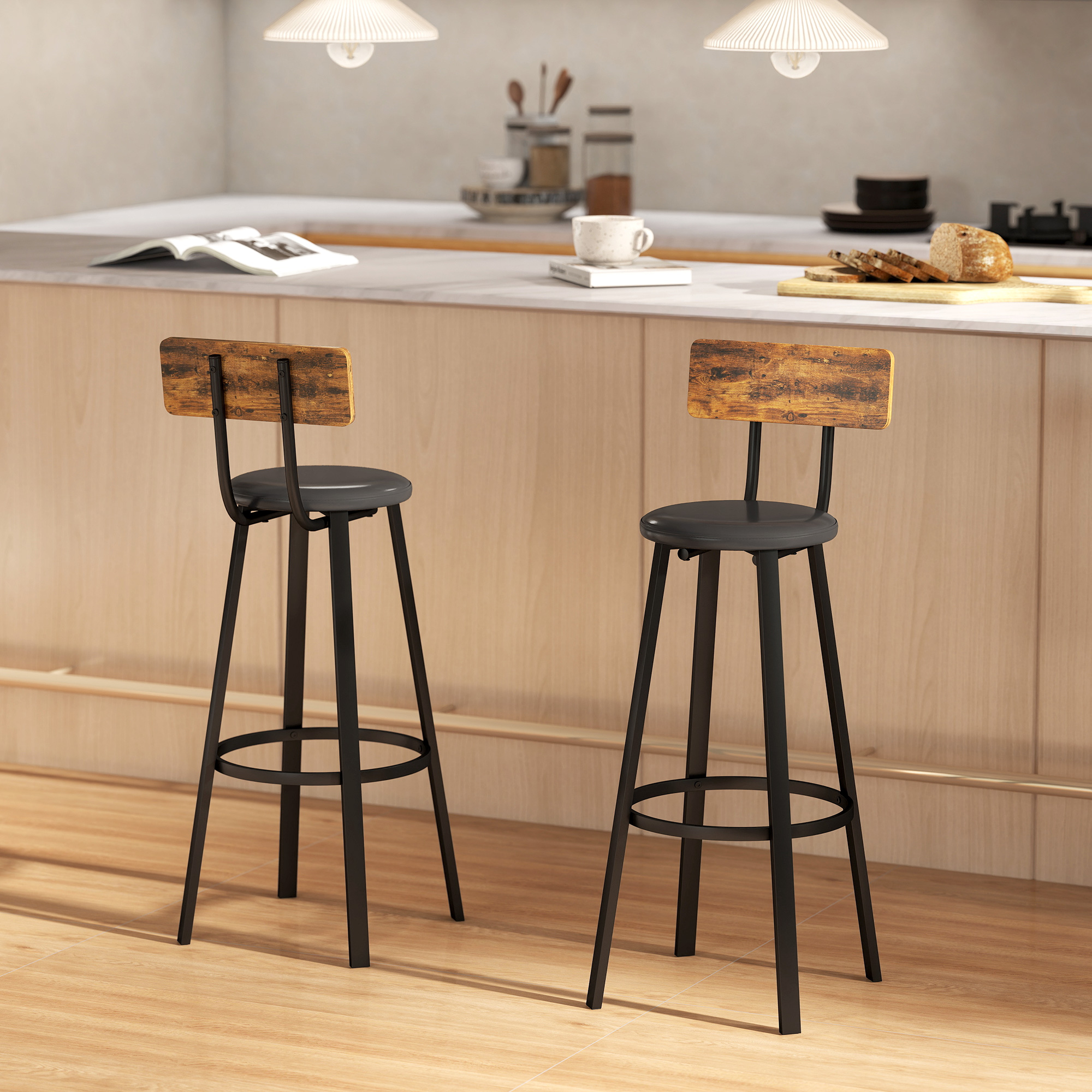 Tired of bar stools that force you to choose between style and comfort? Those rushed breakfasts and conversations cut short by hard, wobbly seats can diminish the joy of your home gatherings. Settle in for longer, more relaxing moments on these set of two bar chairs from HOMCOM. The blend of rustic brown panels and a black metal frame offers industrial charm, while the padded seat and low back provide ergonomic comfort and steadfast support for every cherished family conversation.
