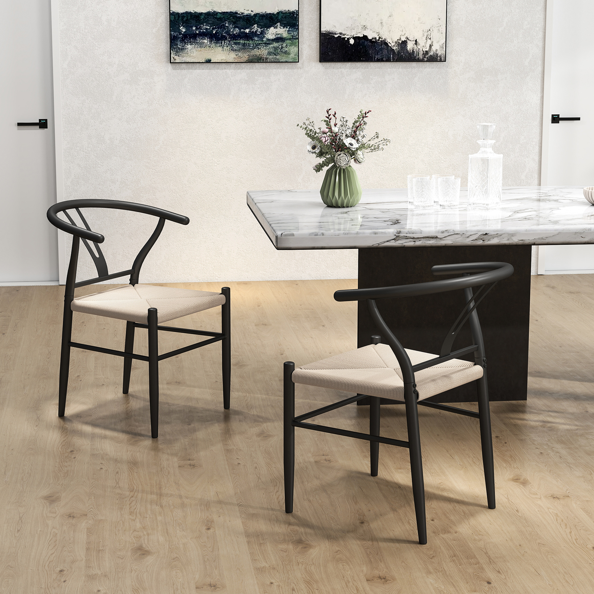 Transform your dining experience with these of two wishbone dining chairs from HOMCOM. These kitchen chairs feature curved backrests and integrated armrests for comfort and support, coupled with a hand-woven paper rope seat for a touch of unique charm. Suitable for kitchens, dining areas, or even creative spaces, these mid-century modern dining table chairs bring a sleek and stylish presence to any room.