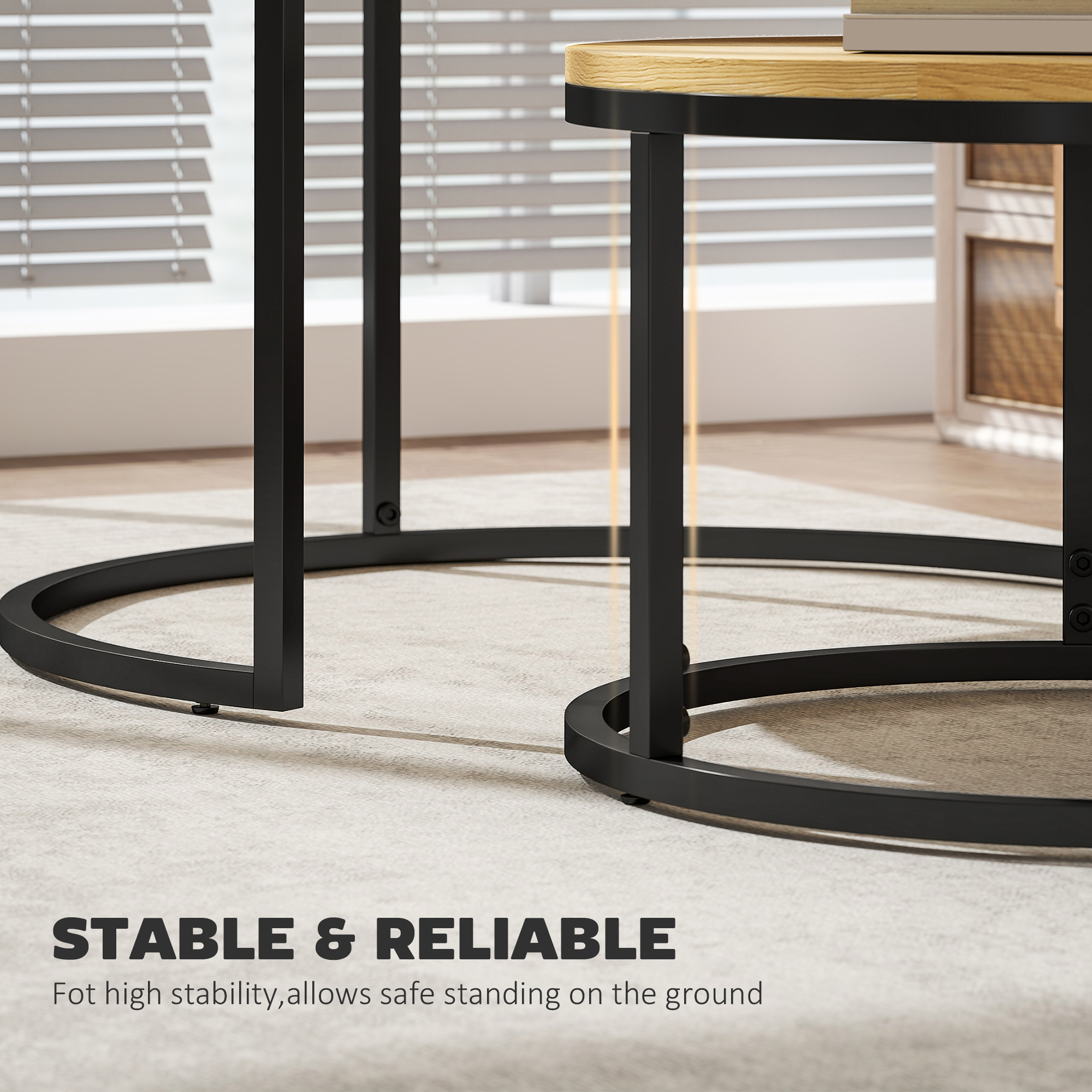 - Round table tops for lots of holding room, made from MDF in a beautiful wood-effect