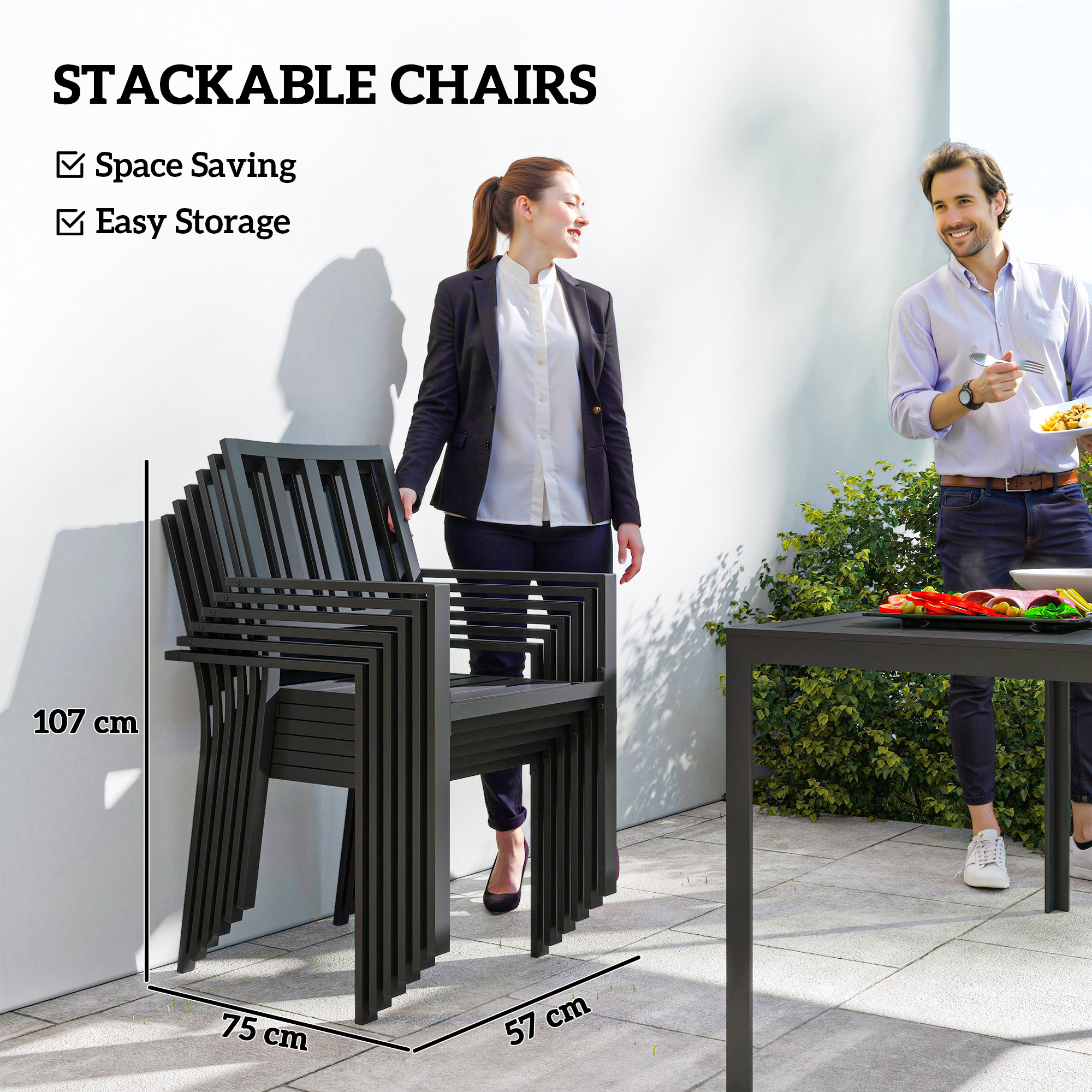- Stackable dimension(six chairs): 107H x 57W x 75D cm