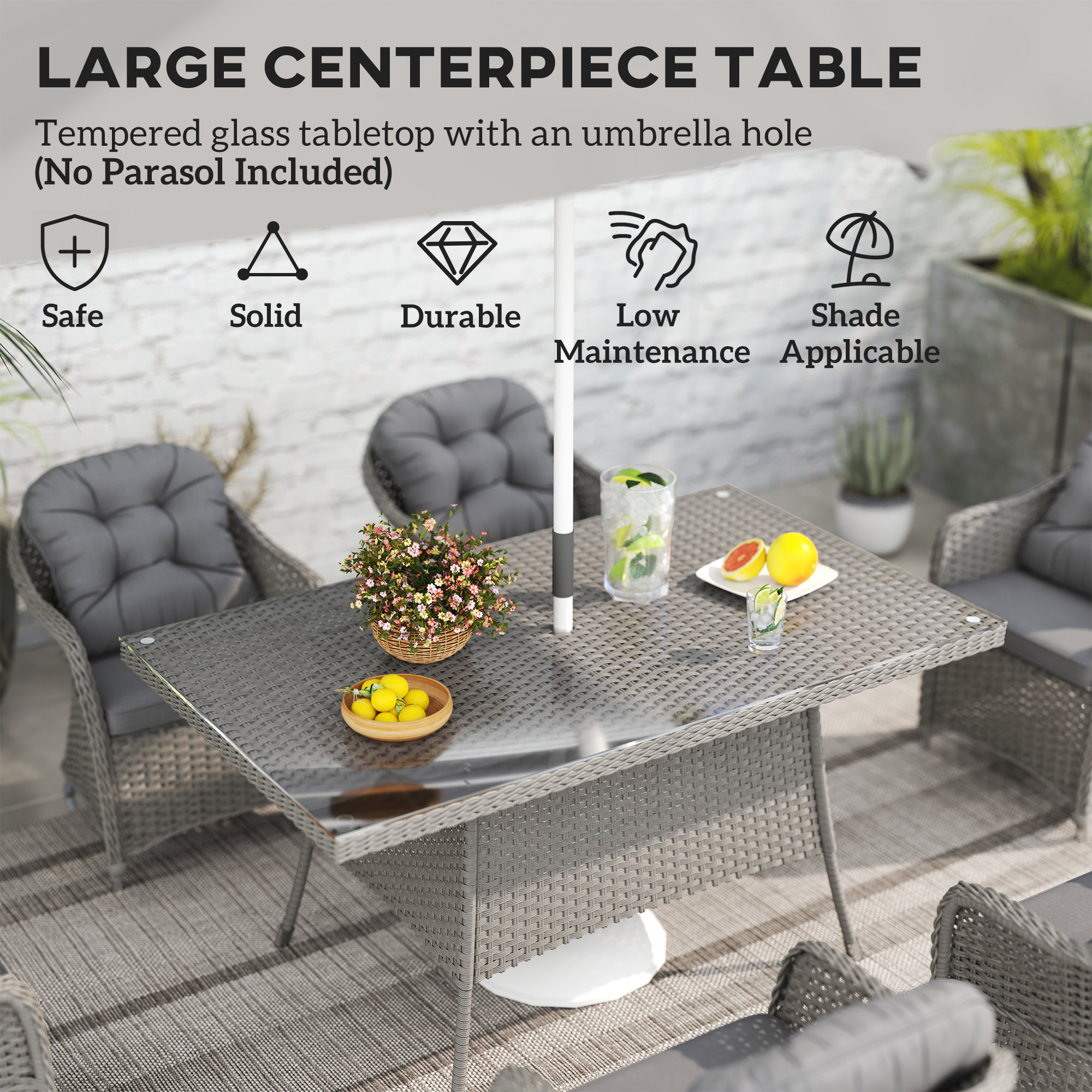 Bring everyone together outside, this season and beyond, with this Outsunny rattan garden furniture set. Includes six chairs and a large table - plenty of space for your favourite company. Each piece is made from powder coated aluminium for a strong core, wrapped in durable and stylish plastic wicker - a protective rattan shell. Keep safely shaded, thanks to the parasol hole in the glass-top table.