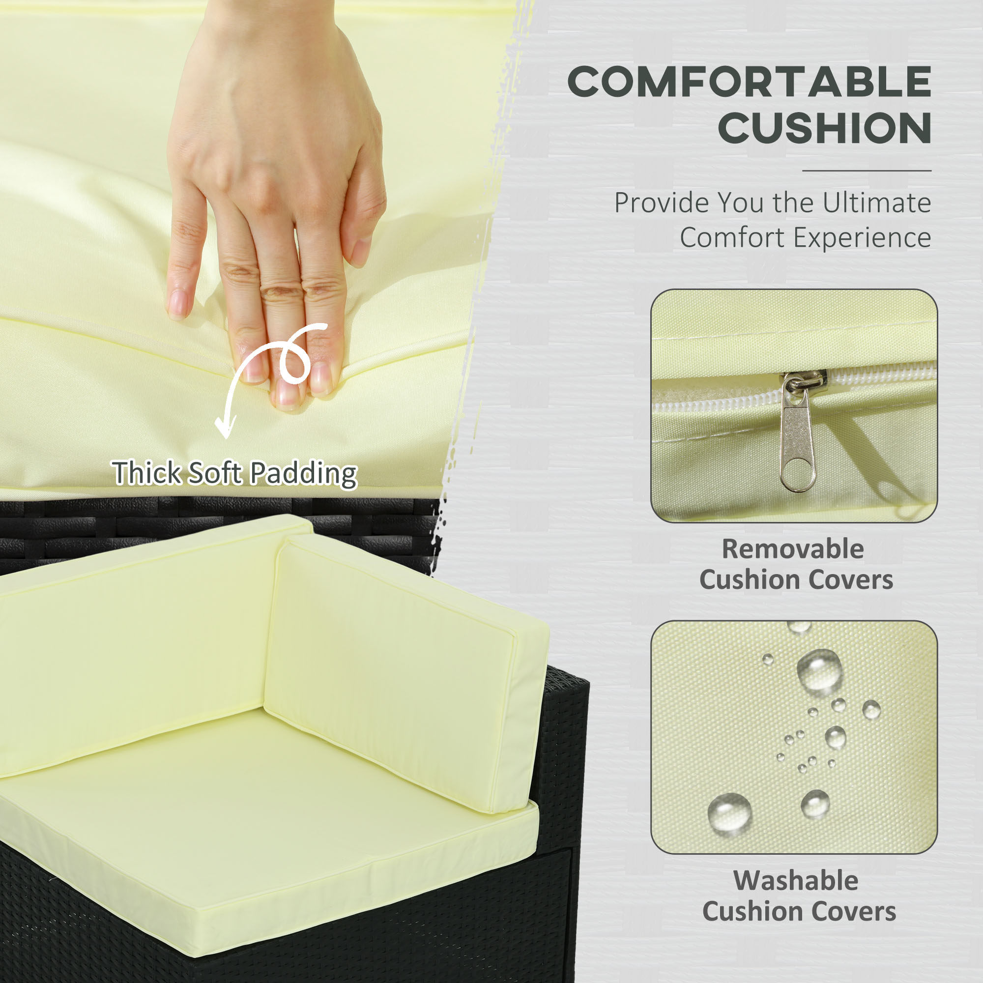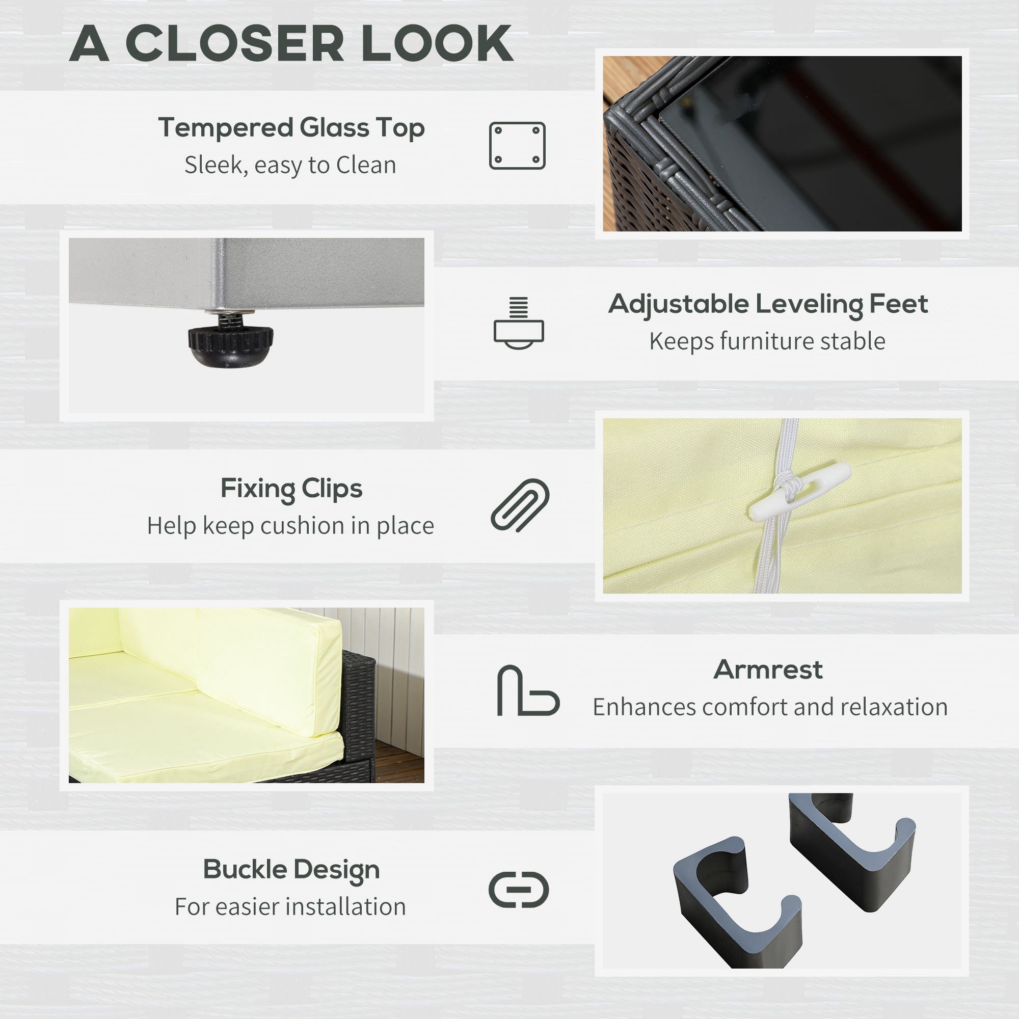 Bring beauty and comfort into your garden with Outsunny patio set. The steel frame of each piece means a strong, supportive structure; wrapped in PE wicker, the rattan top offers extra protection and style. Padded seat and back cushions provide comfort, with two extra pillows included. The rattan corner sofa is easy to assemble, with the buckle fastenings keeping all pieces secure. Set is completed with a safe tempered glass top on the table for a sleek look.
