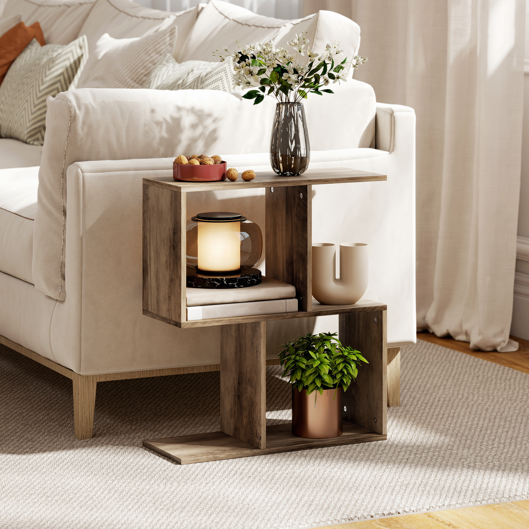 Discover the charm of minimalism with the side table from HOMCOM. Its unique S-shaped design not only enhances your space with a sleek, modern look but also optimises functionality, fitting snugly into small spaces. Enjoy lots of storage with its top surface and four compartments, great for tidying away books, mugs and decor, all while adding a stylish touch as an end table or chic bedside companion.