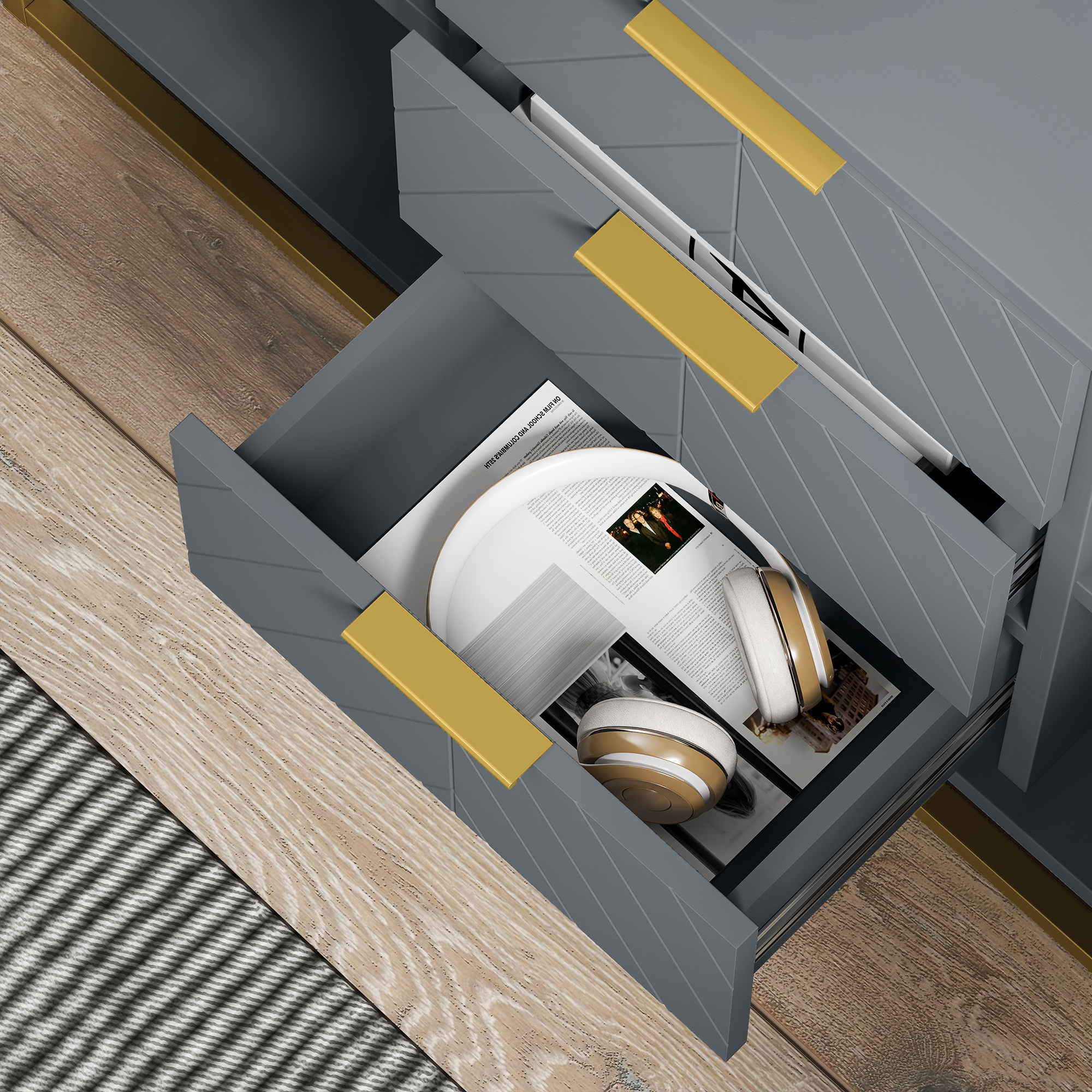 Ready to organise your home space? Pick up the large sideboard and you'll be ready in no time. This clean and sleek kitchen sideboard with luxurious gold tone base and coordinating hardware accents will perfectly match your inner styling. Three drawers and two door cabinets offer an abundance of versatility to effortlessly organise and store away your daily supplies and utensils. Crafted of MDF and steel, it is a robust and attractive addition to your house