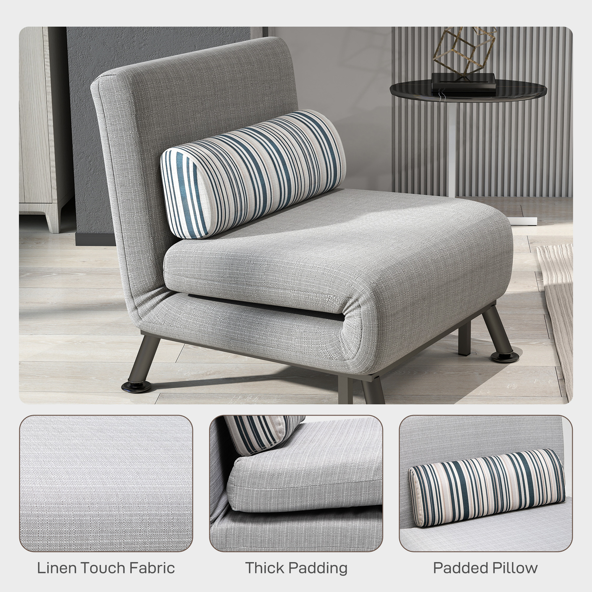 Transform your compact living space with the HOMCOM single futon chair, a perfect blend of style and functionality for small apartments. This versatile piece effortlessly switches from a cozy chair to a comfortable bed, ideal for unexpected guests or a relaxing evening. Its sturdy steel frame and five-level adjustable back ensure durability and personalized comfort. Wrapped in elegant linen-look fabric and filled with plush foam, it includes a pillow for added support.