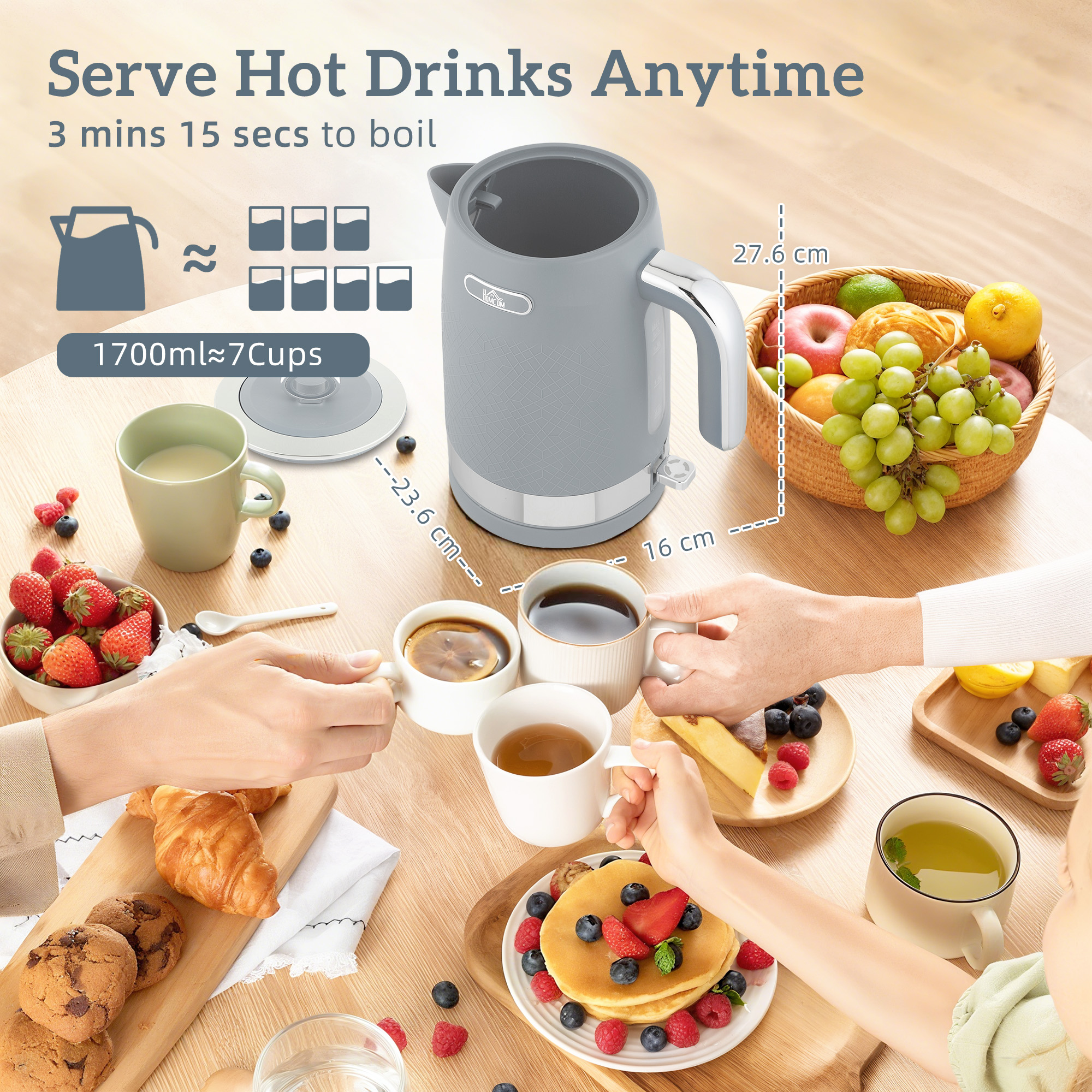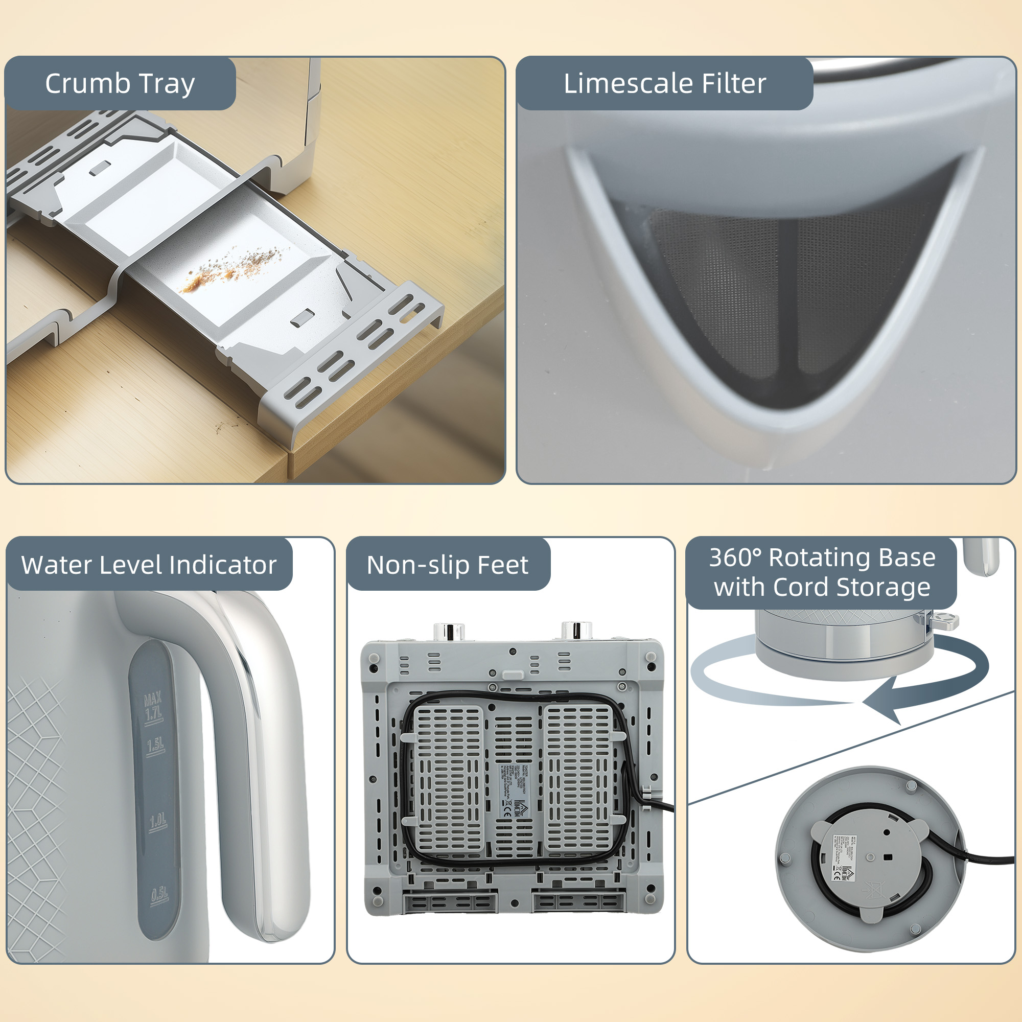 Super sleek, with a touch of texture: welcome this HOMCOM kettle and toaster set onto countertops. Both pieces blend a curved shape, with polished metal accents and in a matte colour finish with a touch of texture - a distinctive set for your kitchen. Fitted with an Otter thermostat, the 1. 7L kettle boils water within minutes, so everyone can enjoy a hot drink quickly. The wide slot four-slice toaster has seven browning levels to enjoy just how you like it.