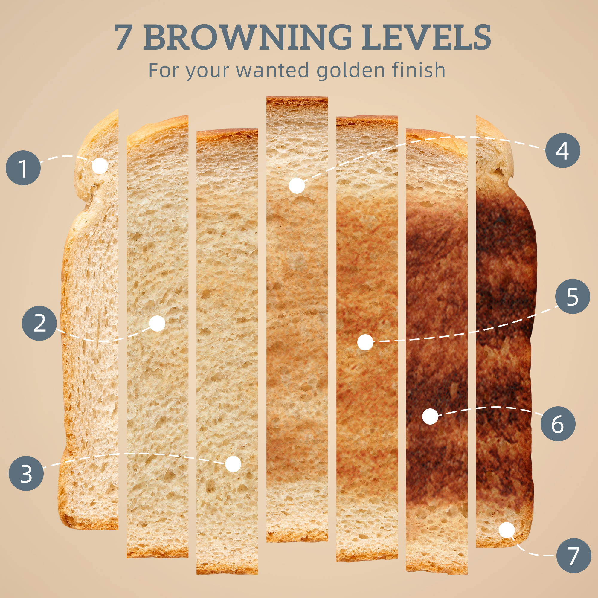 - Four-slice toaster has seven browning levels, with defrost, reheat and cancel function