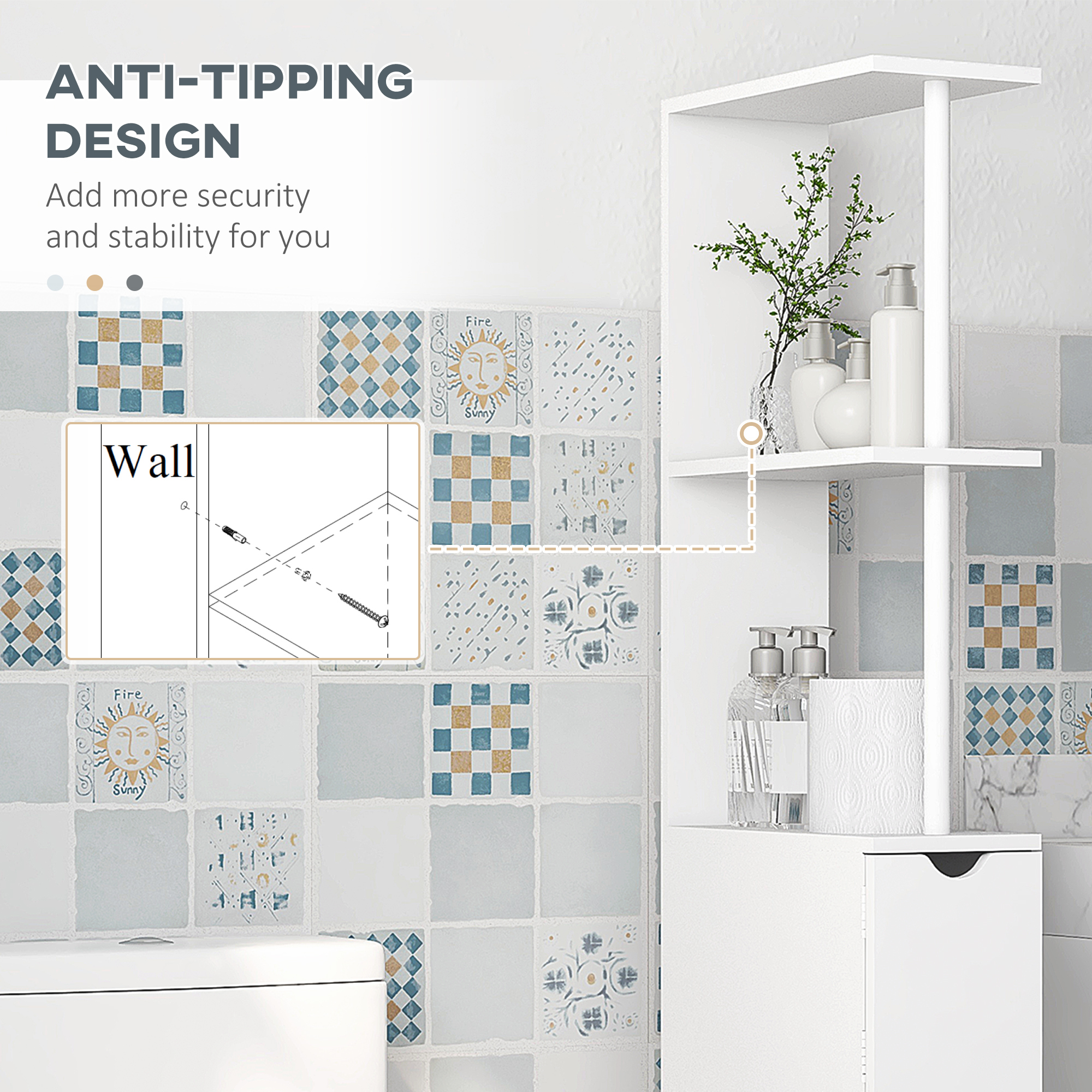 Tall, narrow and stylish - what's not to love about this HOMCOM bathroom cabinet. Providing handy storage in a slim design, this piece is suitable for smaller spaces - bringing you storage into even the smallest spots. Comes with two top shelves (great for towels), small cupboard and two bottom drawers (great for hygiene and cleaning products). Comes with anti-tipping straps to attach to a wall for safety.