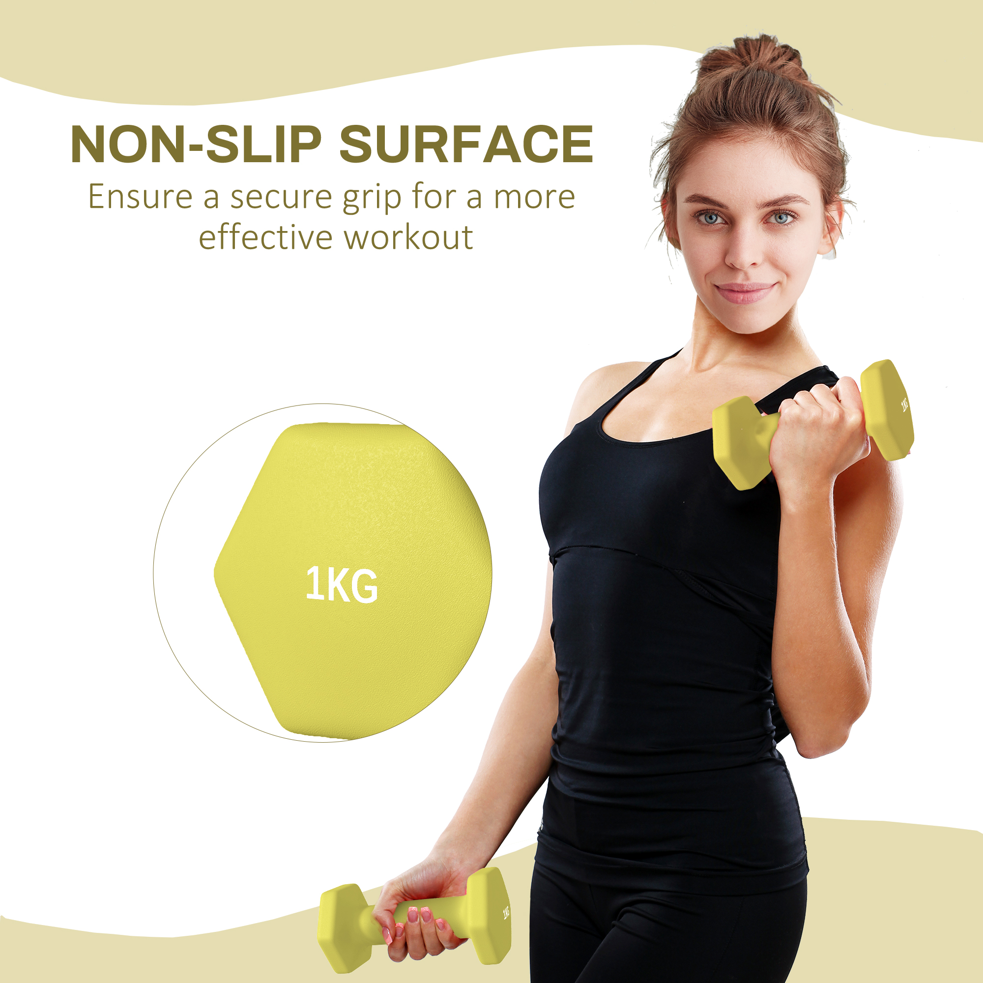 Exercise at home with the SPORTNOW dumbbell set. Featuring two 1kg hand weights, they're great for bicep curls, shrugs, lunges and much more. Its hexagonal shape stops the weights from rolling off – they'll stay right where you left them. Non-slip handles ensure a secure and comfortable grip, so you can work out confidently. Convenient and easy to use, turn your home into a mini fitness centre, keeping you active and healthy.