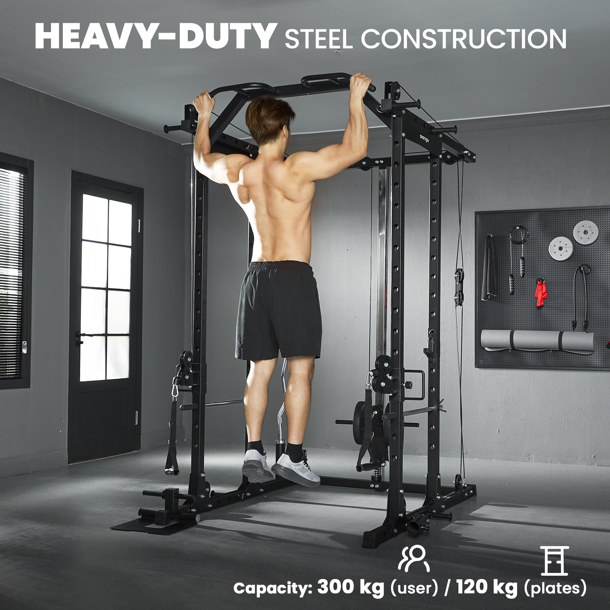 - Weight capacity: 300 kg (users), 120 kg (weight plates)