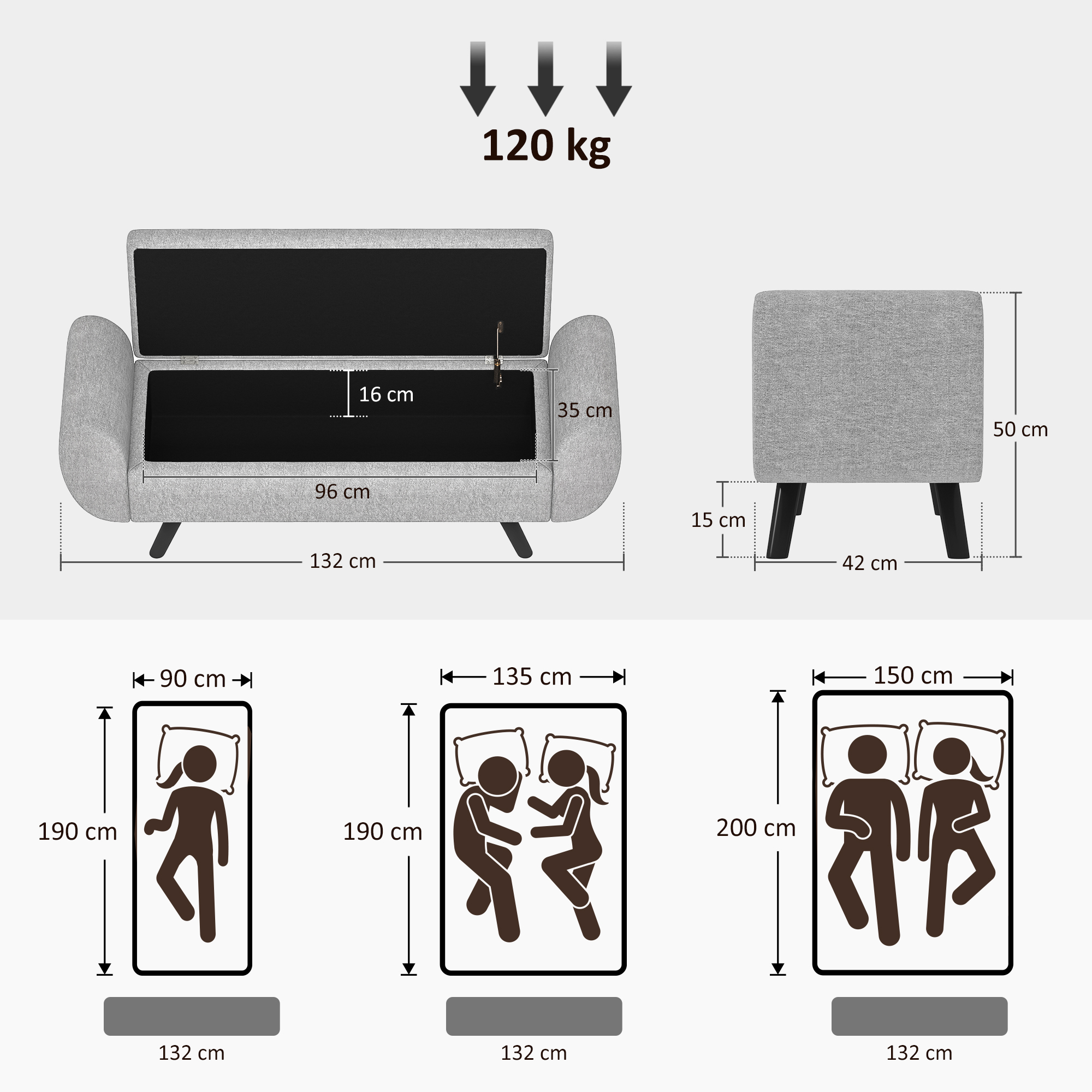 - Storage Size: 96W x 35D x 16H cm