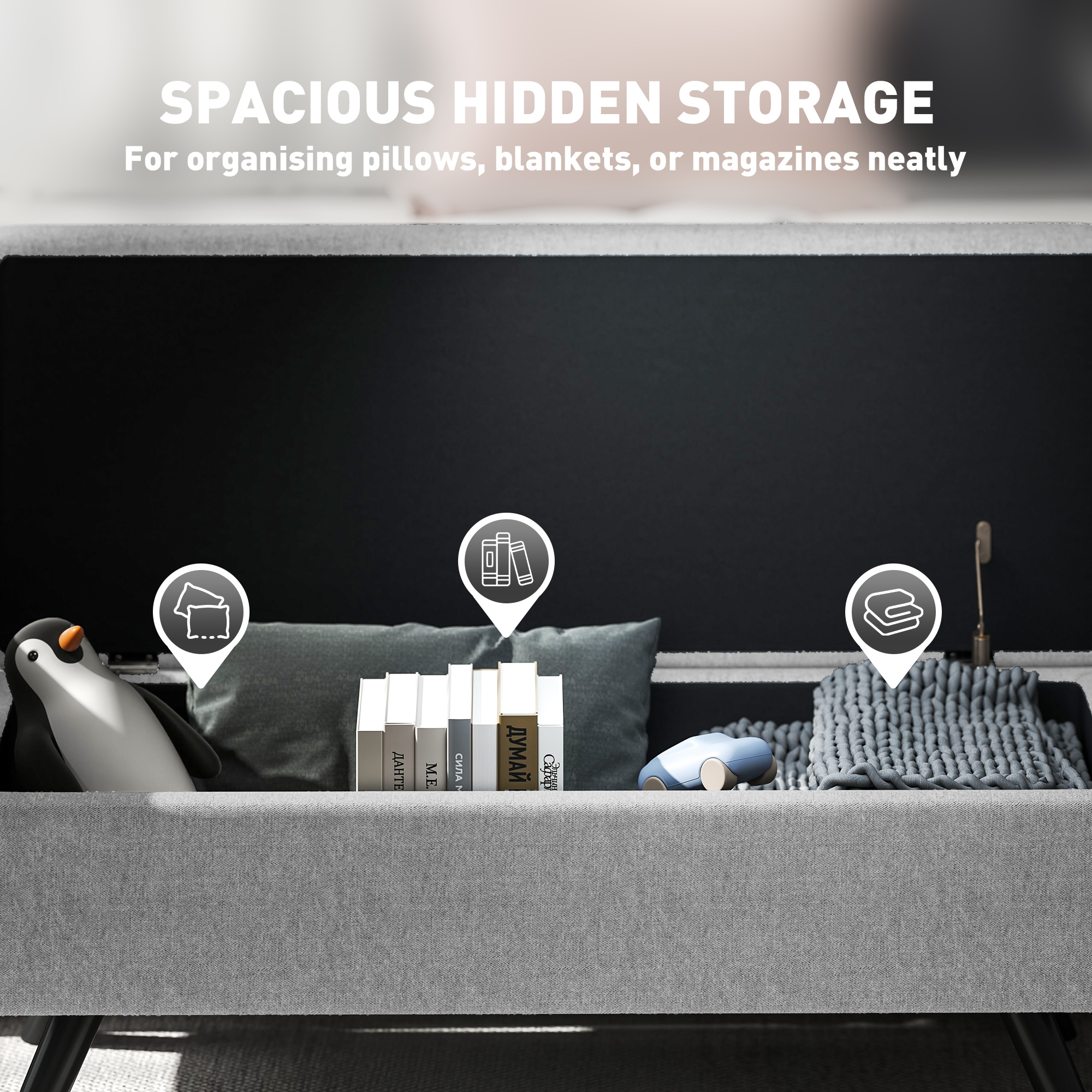 Discover the charm of the HOMCOM Storage Seat, where style meets functionality. Wrapped in breathable linen, this storage ottoman not only beautifies your space but also offers a 53. 8-litre storage chest with a lift-top design for smooth access. Suitable as a footstool, window seat, or end of bed bench, it's a versatile addition to any room.