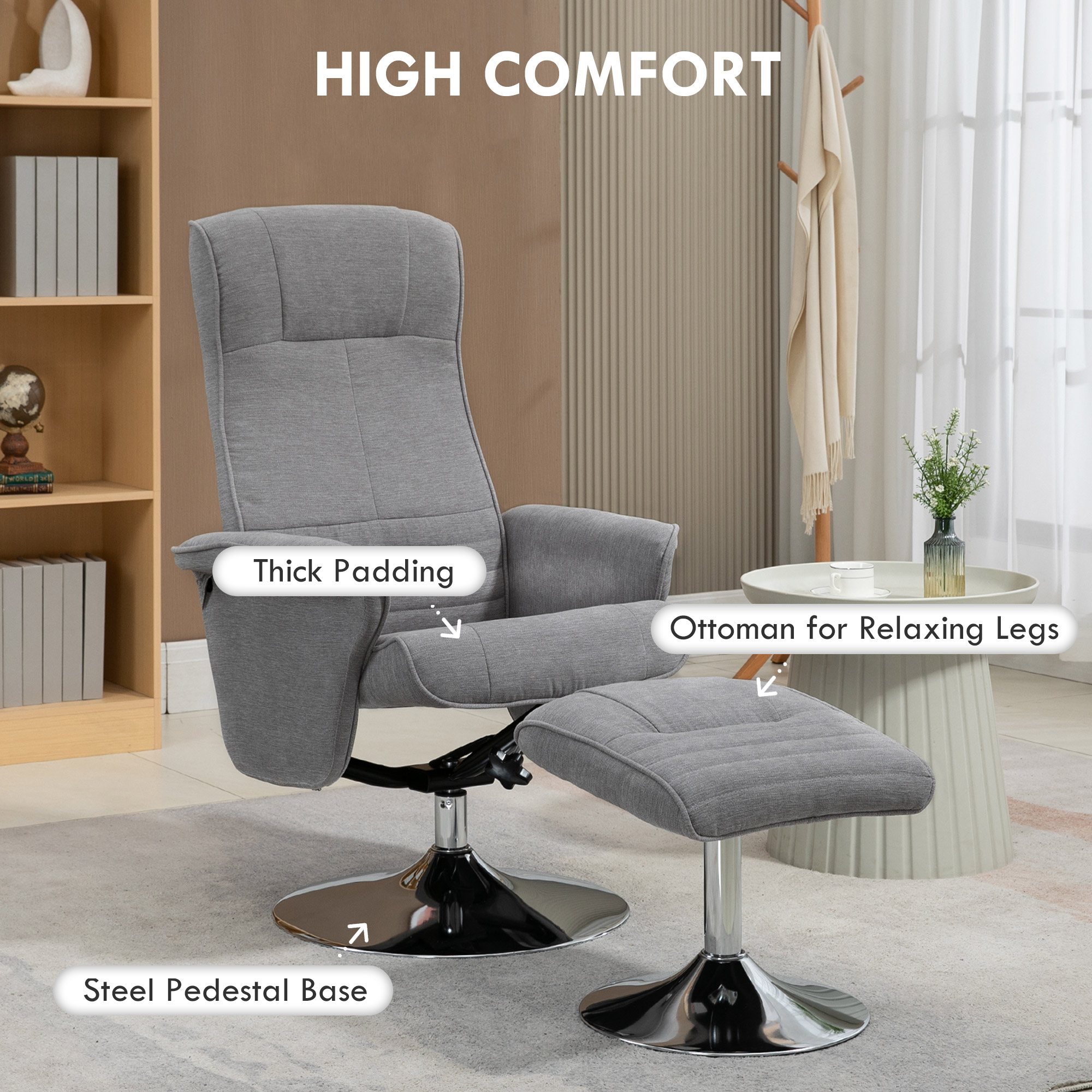 Whether you're watching the big game, flipping through a magazine, or drifting off for an afternoon nap, a swivel recliner chair with an ottoman makes it easy to unwind. The high-slanted back, supportive headrest and all-over padding offer lasting comfort, while the soft velvet-feel fabric adds warmth and a cosy touch. Recline up to 135° and relax—after a long day or on a slow Sunday, this upholstered armchair and ottoman are just what you need.