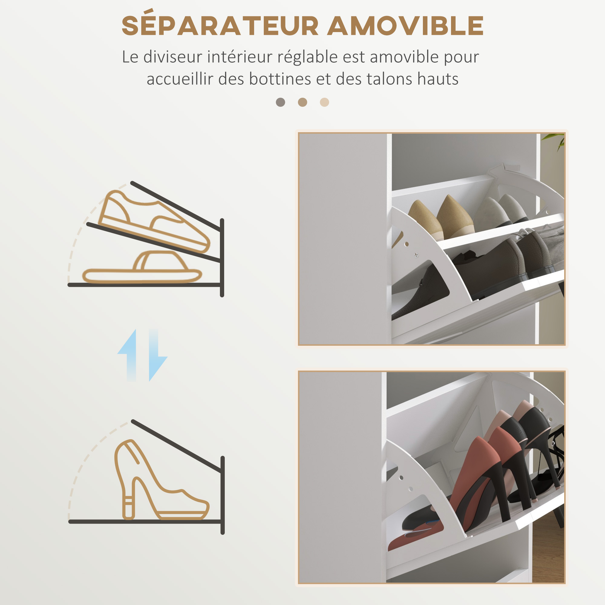 - Two-level adjustable inner shelves for different footwear