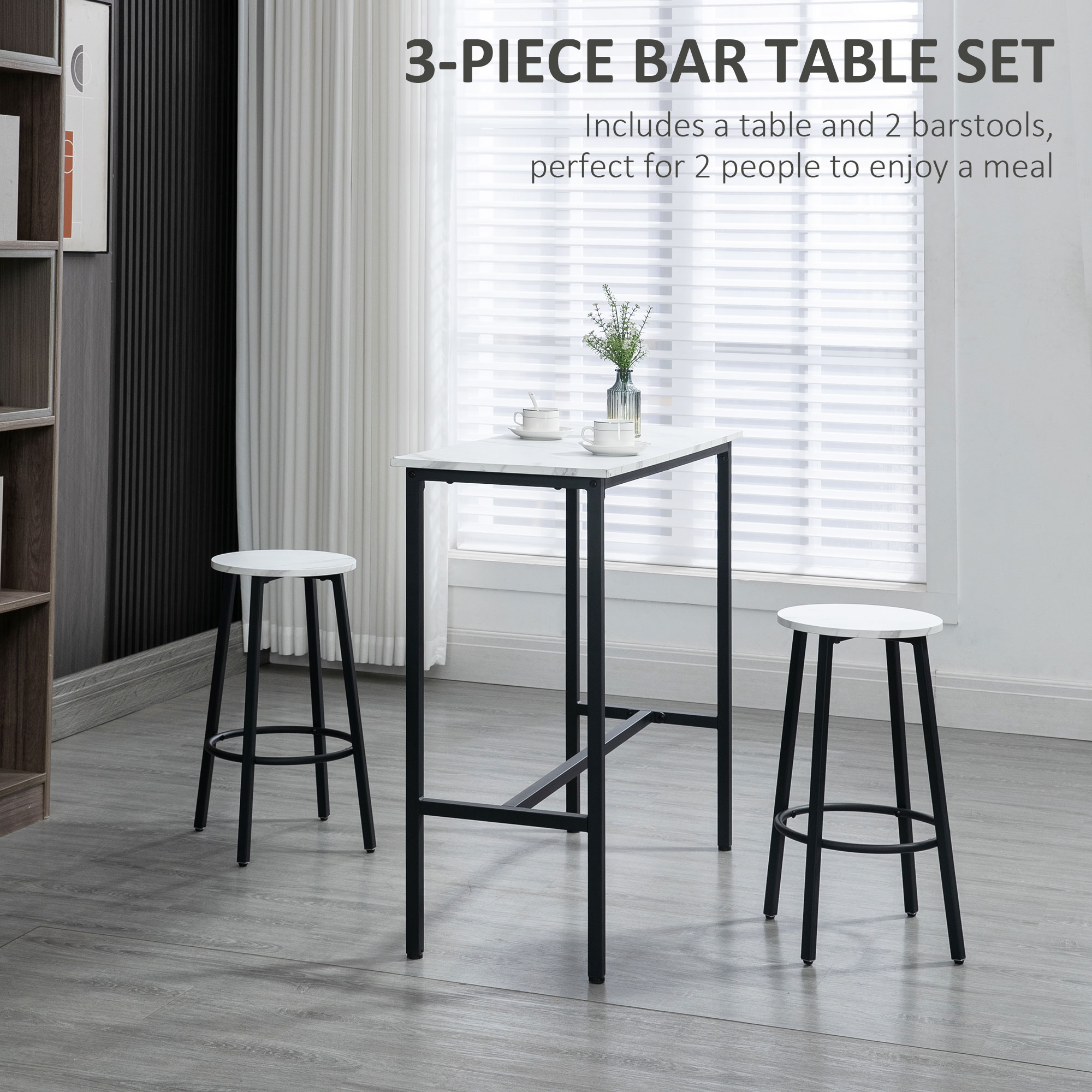 With this HOMCOM two-person dining set, you can sit with company, to enjoy a meal together - day and night - with the table and two stools. Powder coated steel frames mean a strong core, whilst the marble-effect top tops bring a touch of elegance. Both the kitchen table and the chairs feature a bottom bar to rest your feet so they don't annoyingly dangle.