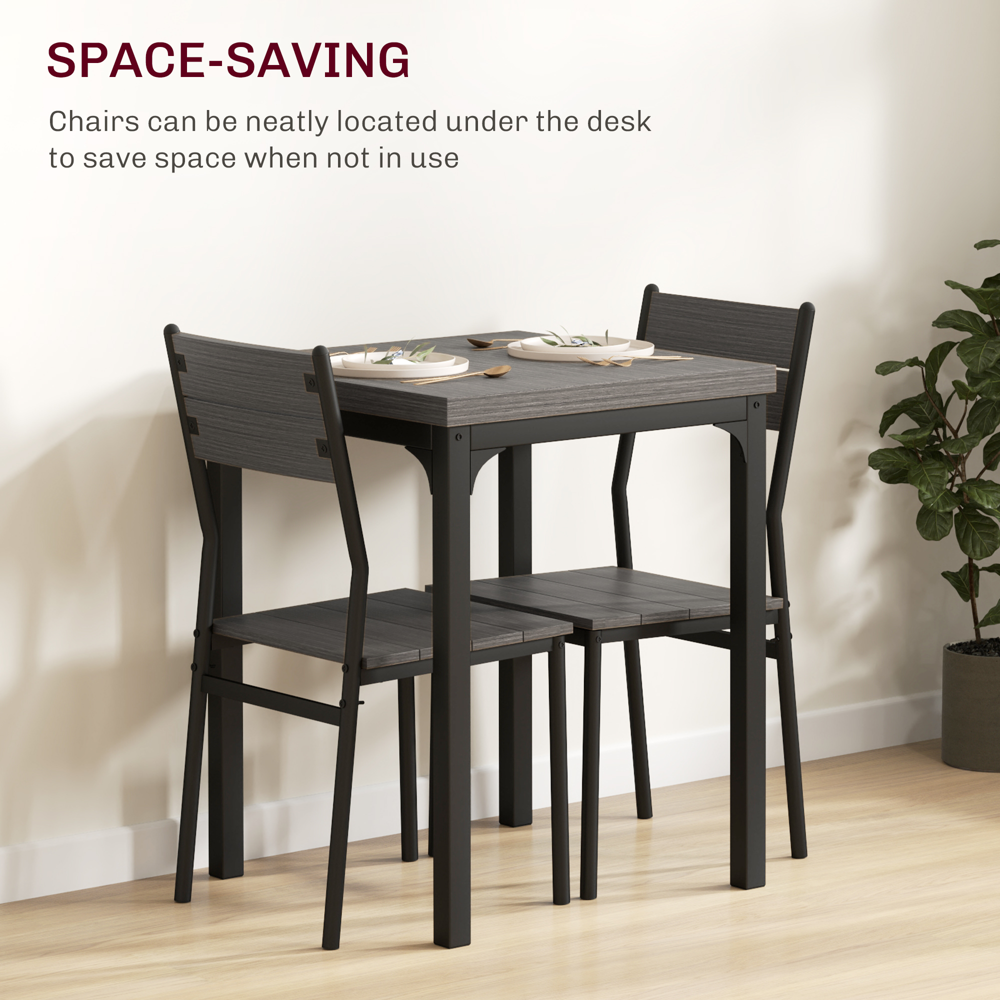 For a stylish, go-to dining spot, look no further than this HOMCOM dining table set. The metal frames mean a strong core, with robust MDF tops in a wood-effect finish for a natural look-looks great in plenty of interiors. Compact in size, this 2 person table set is suitable even for the smallest of spaces-your go-to when inviting friends over for dinner, drinks and more.