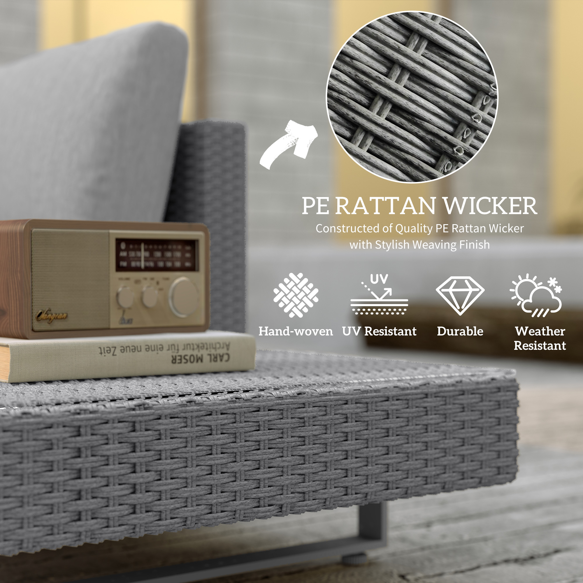 - Steel frame for a strong core, wrapped in stylish and protective plastic rattan