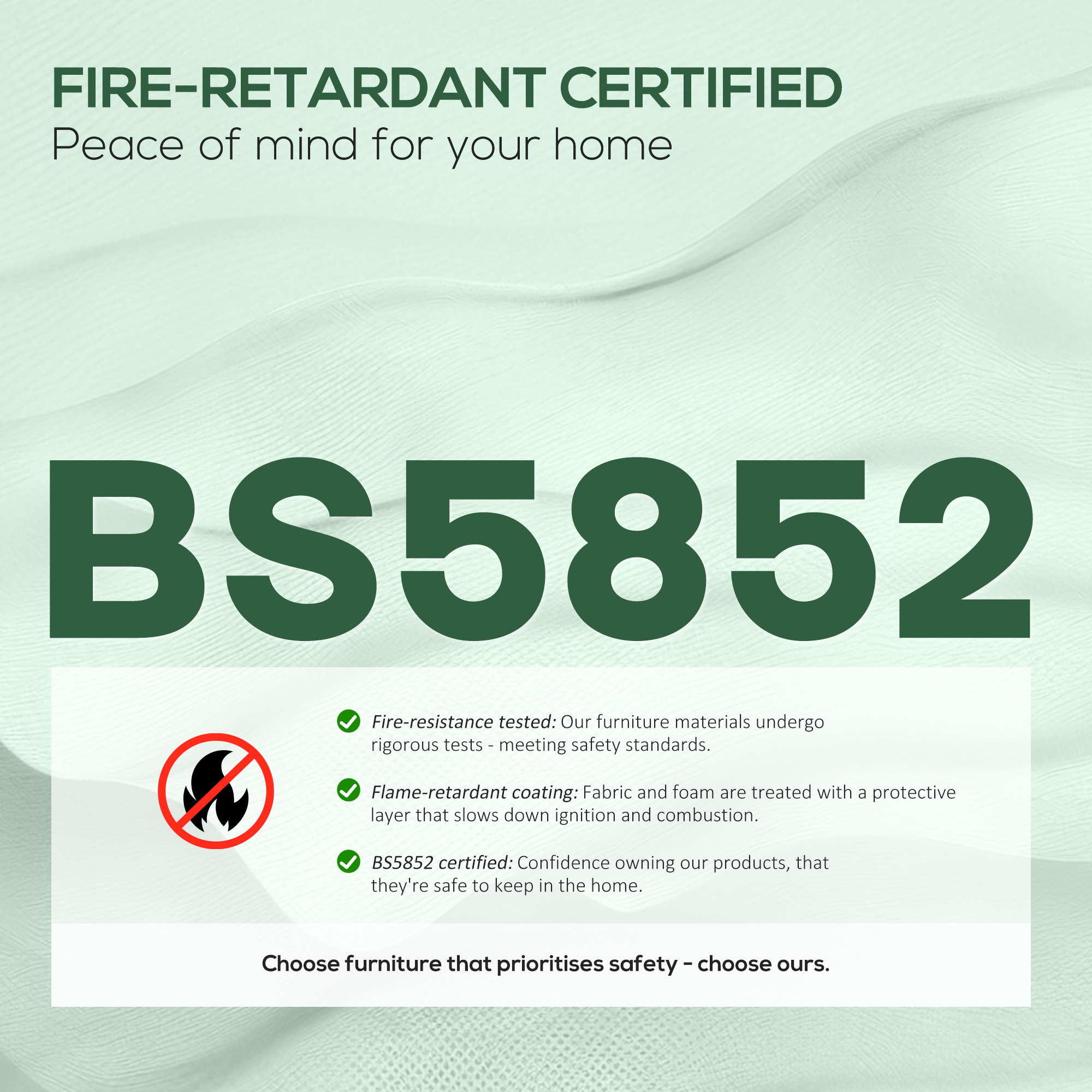 - Tough wood and metal frame, with fire-retardant materials for safety