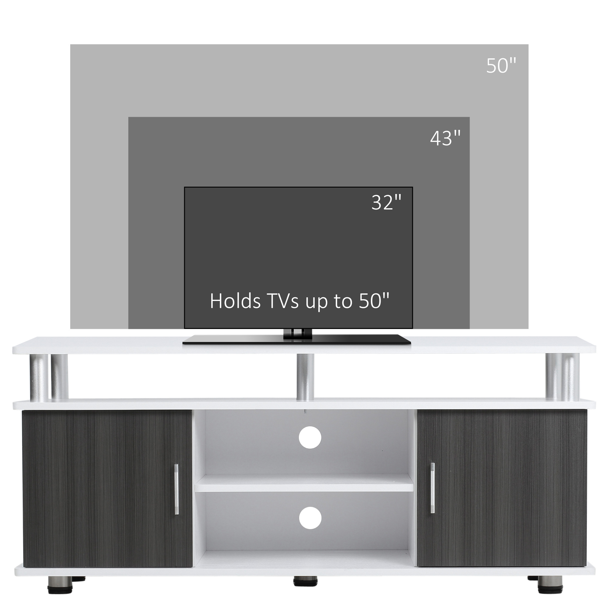 HOMCOM TV unit blends perfectly into your modern, simple lifestyle. It features the large top panel which holds up to 120 cm flat panel TV screen. There are also open display shelves to hold your entertainment equipment and two compartments with doors for your loose stuff such as CDs, DVDs, and games. Designed to be lightweight and space-saving. The cable management system helps you maintain a tidy entertainment space.
