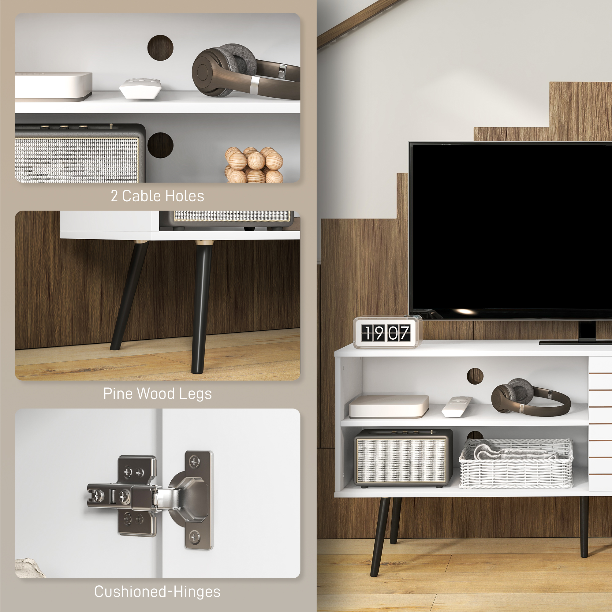 Upgrade your living room with this HOMCOM TV stand cabinet. This media unit comes with two open shelves and a side cupboard - plenty of room for media devices and related accessories. Made from particle board for a sturdy structure, it is complete with a cable management hole on the back to keep wires neatly together.