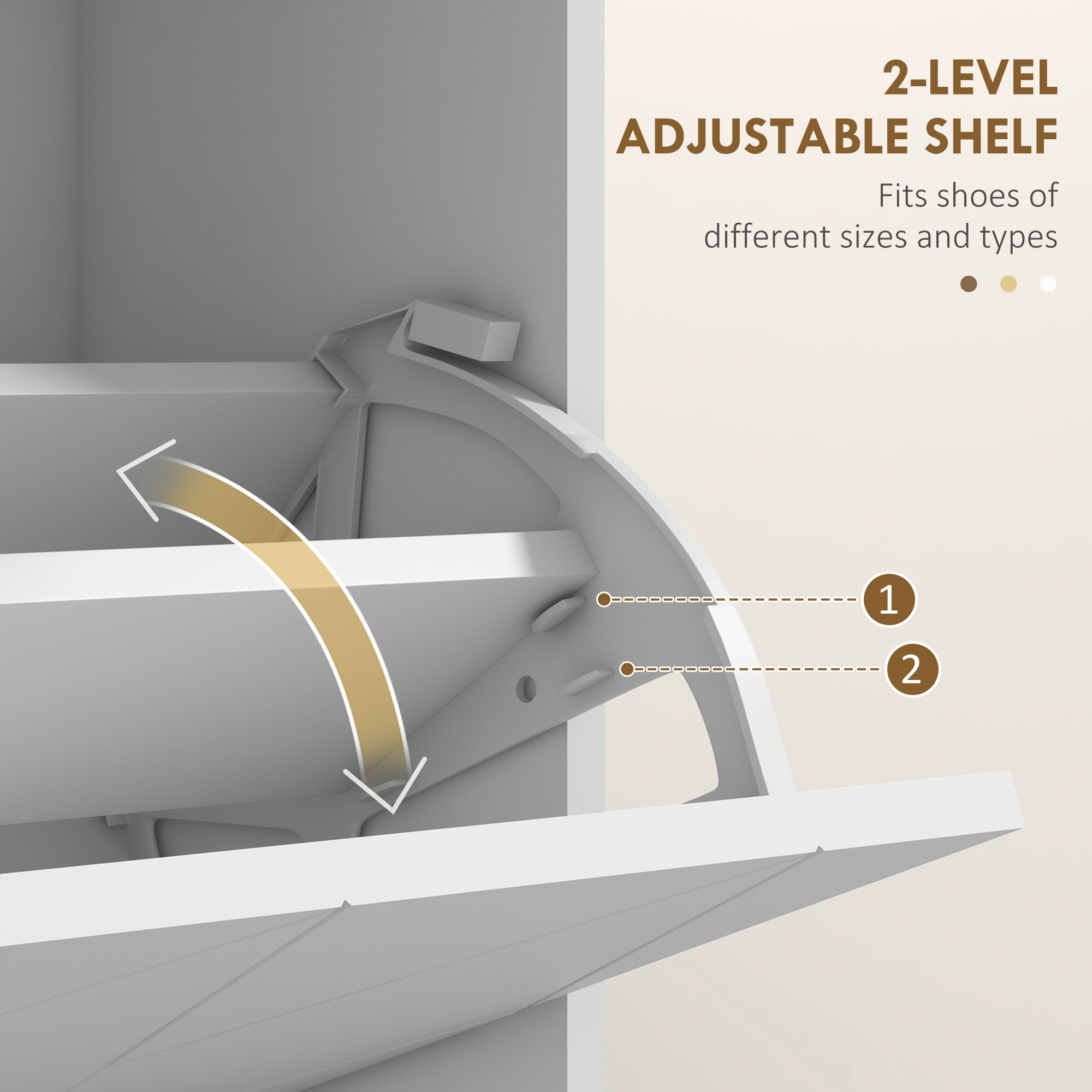 Protect shoes, in a space-conscious way with this HOMCOM narrow shoe cabinet. The two doors protect footwear from dust and similar to keep them fresh and clean. It comes with two flip drawers, holding in total 12 shoe pairs; move the adjustable shelves to fit in differently-sized pieces. This white shoe cabinet also comes with a top drawer for smaller pieces, complete with anti-tipping straps to fix to a wall.