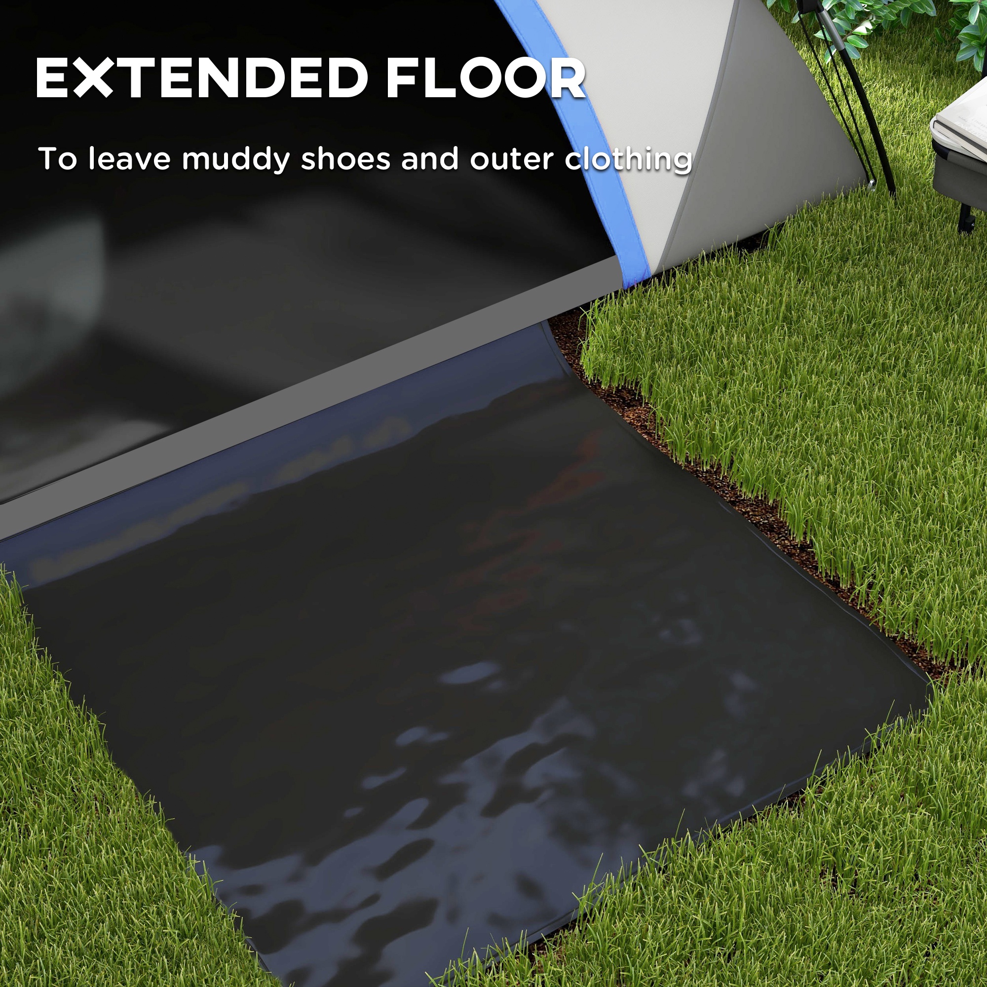 - Sewn-in groundsheet, with front floor panel for dirty shoes and clothing