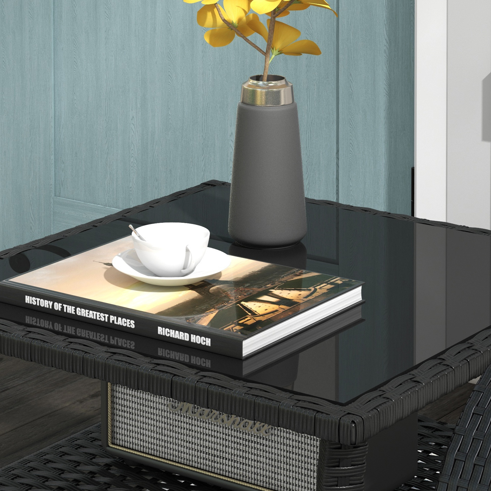 Blending on-trend rattan with a sleek glass top, this Outsunny four-seater garden coffee table is a striking piece for your outdoors. A powder coated steel frame for a strong and supportive core, the outer is wrapped in plastic wicker; offering double the durability and a garden-ready look. The tempered glass tabletop means a safe and solid dining surface which can be easily wiped clean. With a bottom shelf, you can also keep small pieces close altogether.